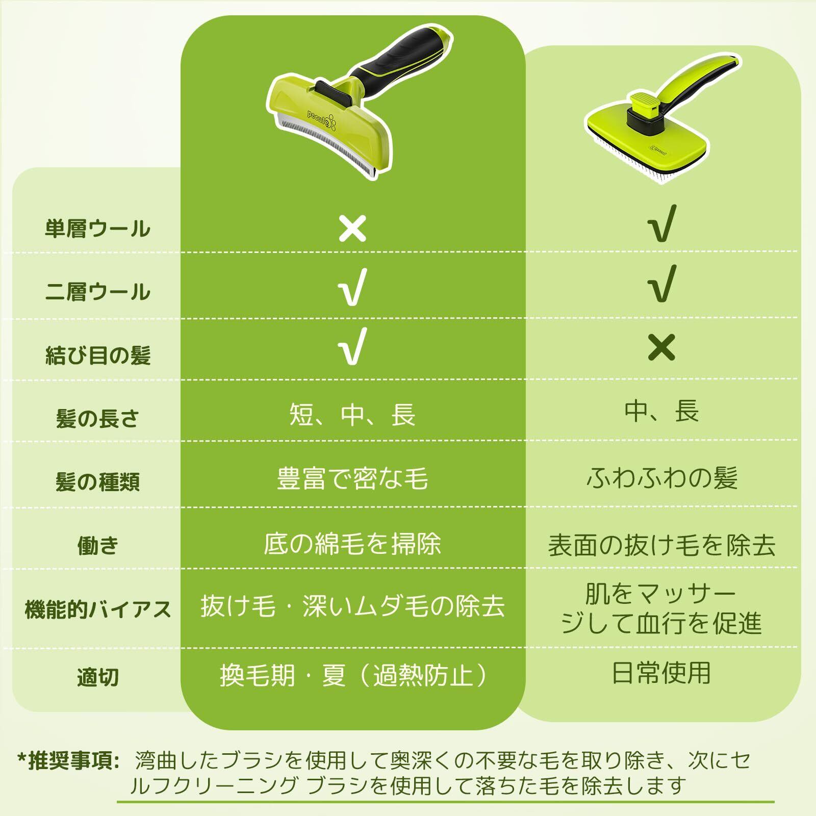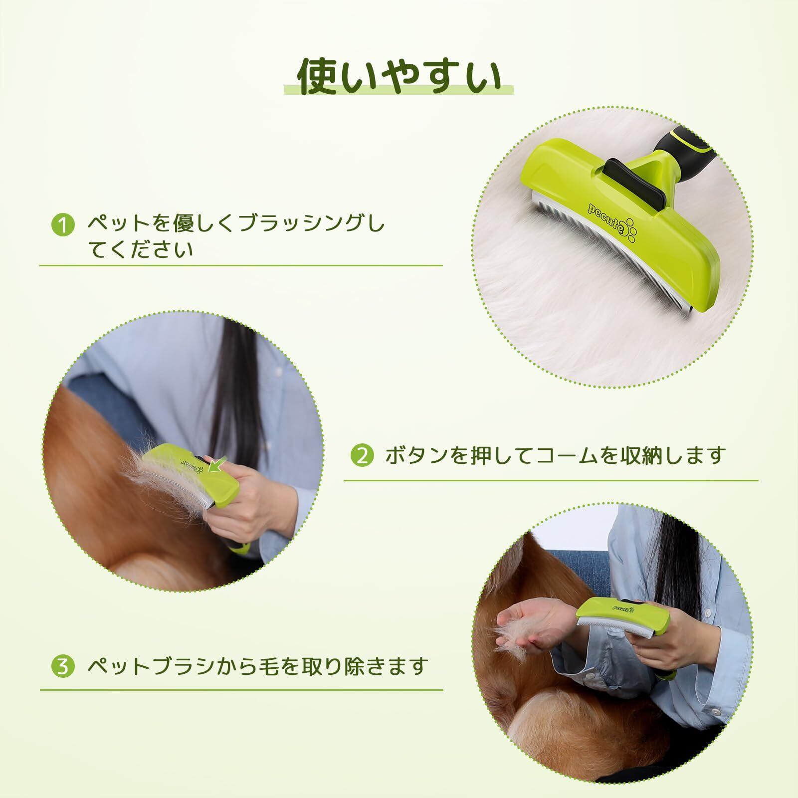【安全で丈夫な素材】ペットブラシ本体はABSとTPRの環境に優しい素材を採用しており、安心してご使用いただけます。 304ステンレス鋼の刃、錆びず、長期間使用できます。 また、独自の刃の設計により、使用中にペットの皮膚を傷つけません。※ 但し、ワンちゃんの背中をブラッシングする際、刃が背骨にあたると痛いので優しく、ゆっくりとブラッシングしてください。