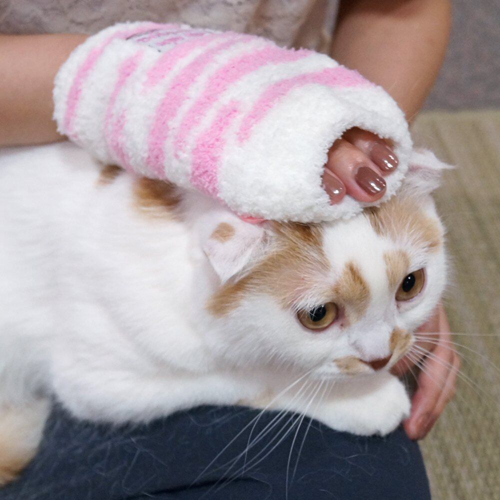 ・右手にはねて使うミトンタイプの猫撫でブラシ。指先は出せるので便利。