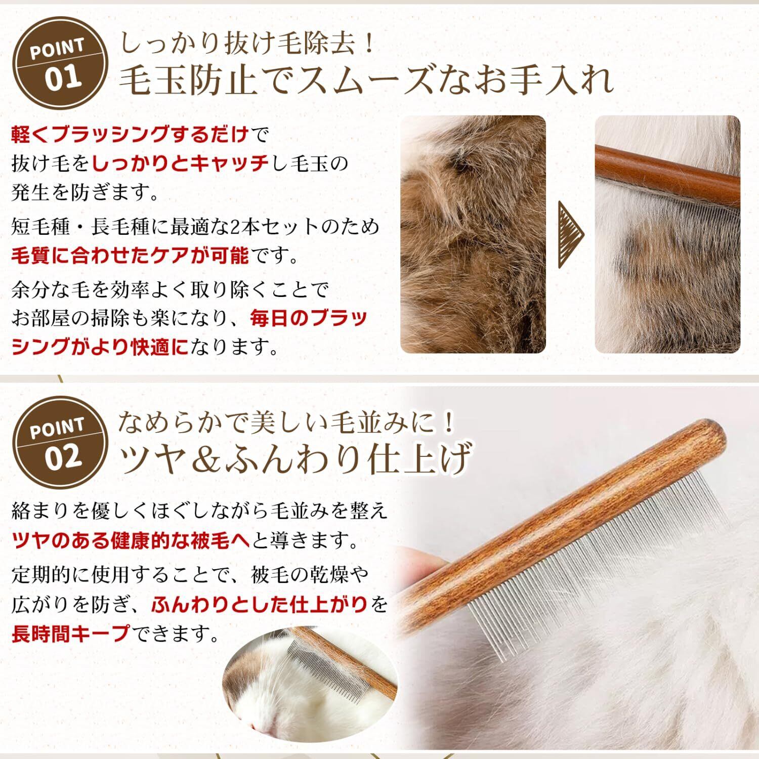 【しっかり抜け毛除去!毛玉防止でスムーズなお手入れ】 軽くブラッシングするだけで、抜け毛をしっかりとキャッチし、毛玉の発生を防ぎます。 短毛種・長毛種に最適な2本セットのため、毛質に合わせたケアが可能です。余分な毛を効率よく取り除くことで、お部屋の掃除も楽になり、毎日のブラッシングがより快適になります。