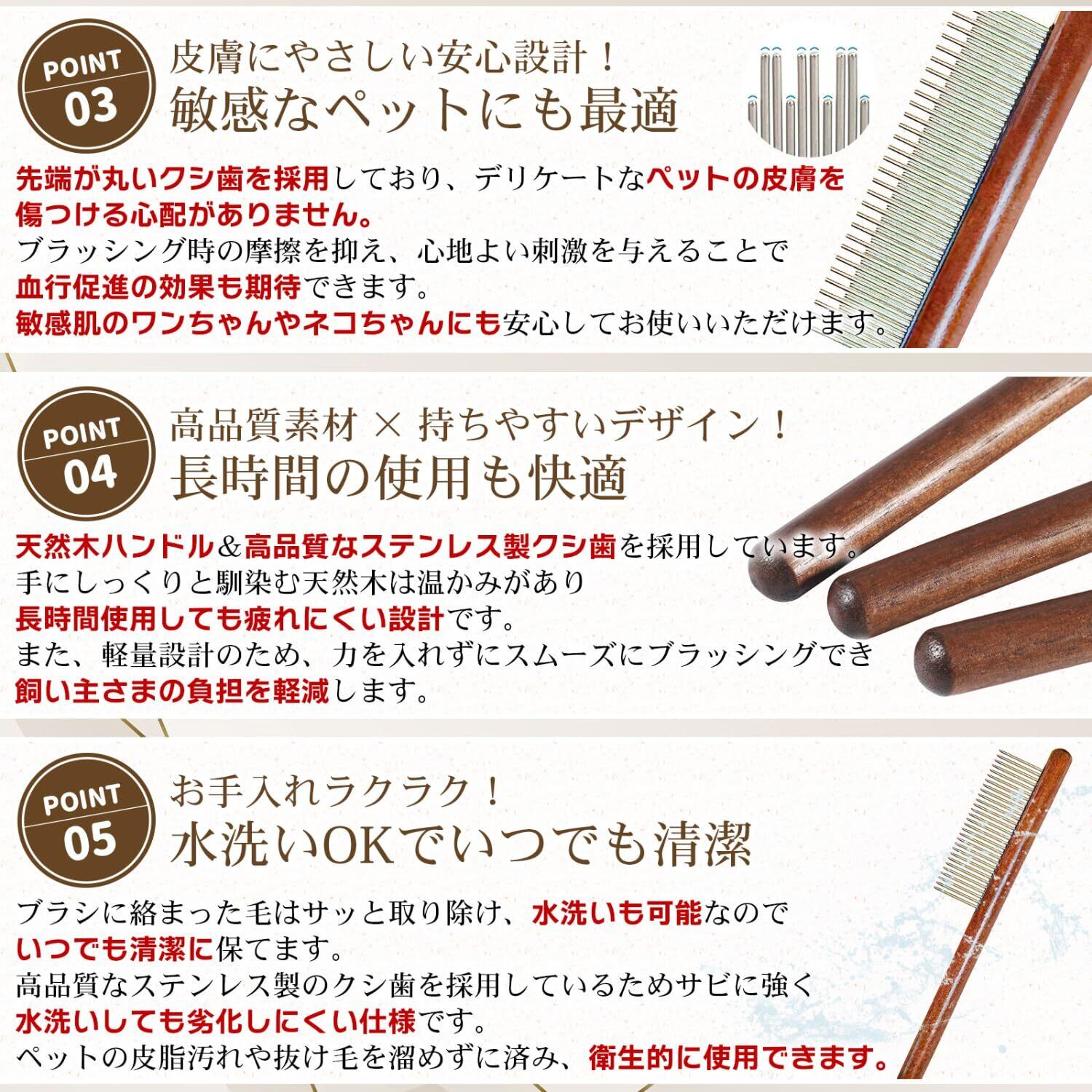 【高品質素材 × 持ちやすいデザイン! 長時間の使用も快適】 天然木ハンドル&高品質なステンレス製クシ歯を採用しています。 手にしっくりと馴染む天然木は温かみがあり、長時間使用しても疲れにくい設計です。 また、軽量設計のため、力を入れずにスムーズにブラッシングでき、飼い主さまの負担を軽減します。