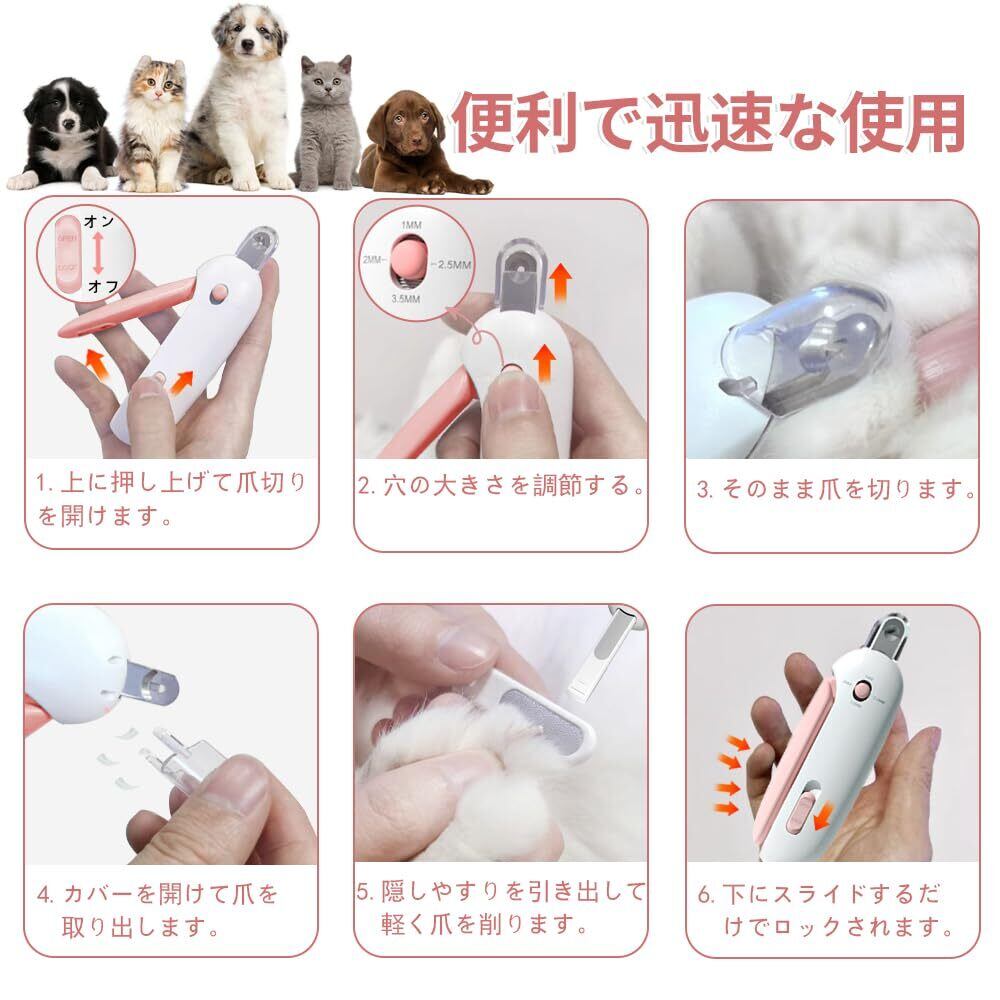 使用方法: 1.ロックボタンをスライドさせてハンドルをロック解除/ロックします。 2.調整ボタンで、ペットの爪に適した安全な穴径(1〜3.5mm)を設定できます。 3.ハンドルを押して爪を簡単に切ります。 4.切った爪は透明な防飛散収納カバーに落ちるため、掃除が不要です。 5.隠れた爪やすりを使ってさらに爪を磨きます。 6.トリミングが完了したら、ハンドルをロックし、収納します。