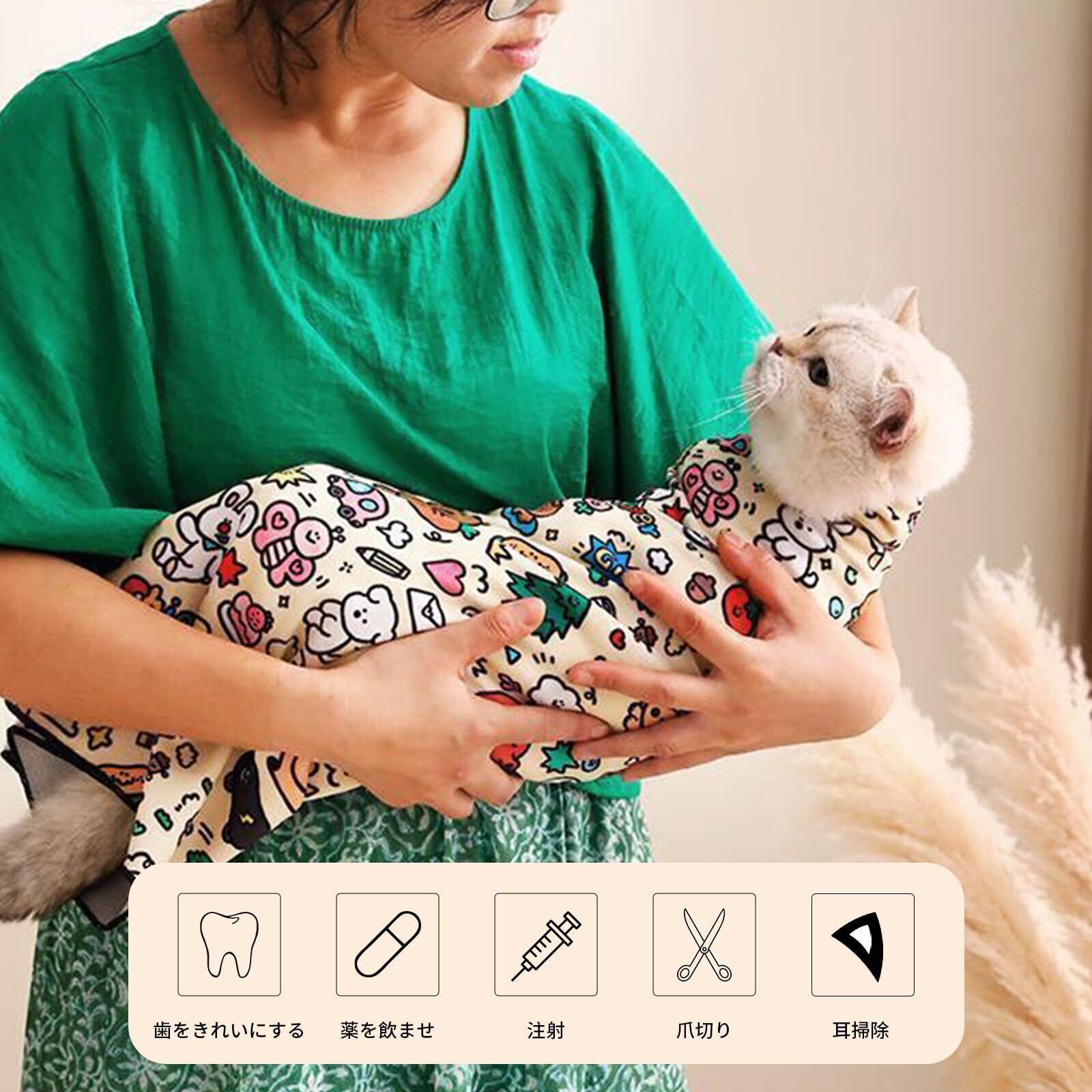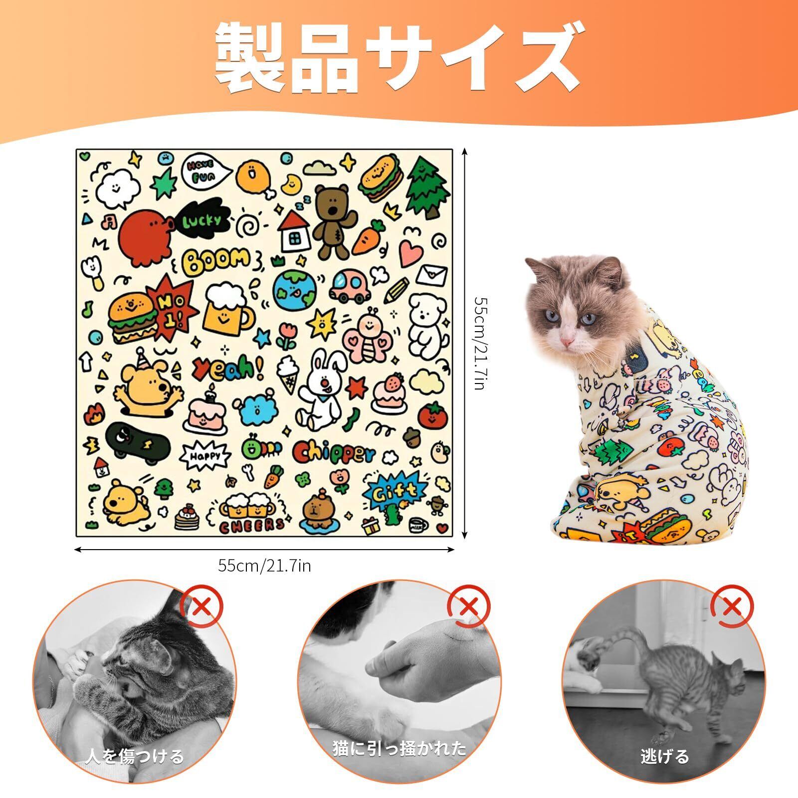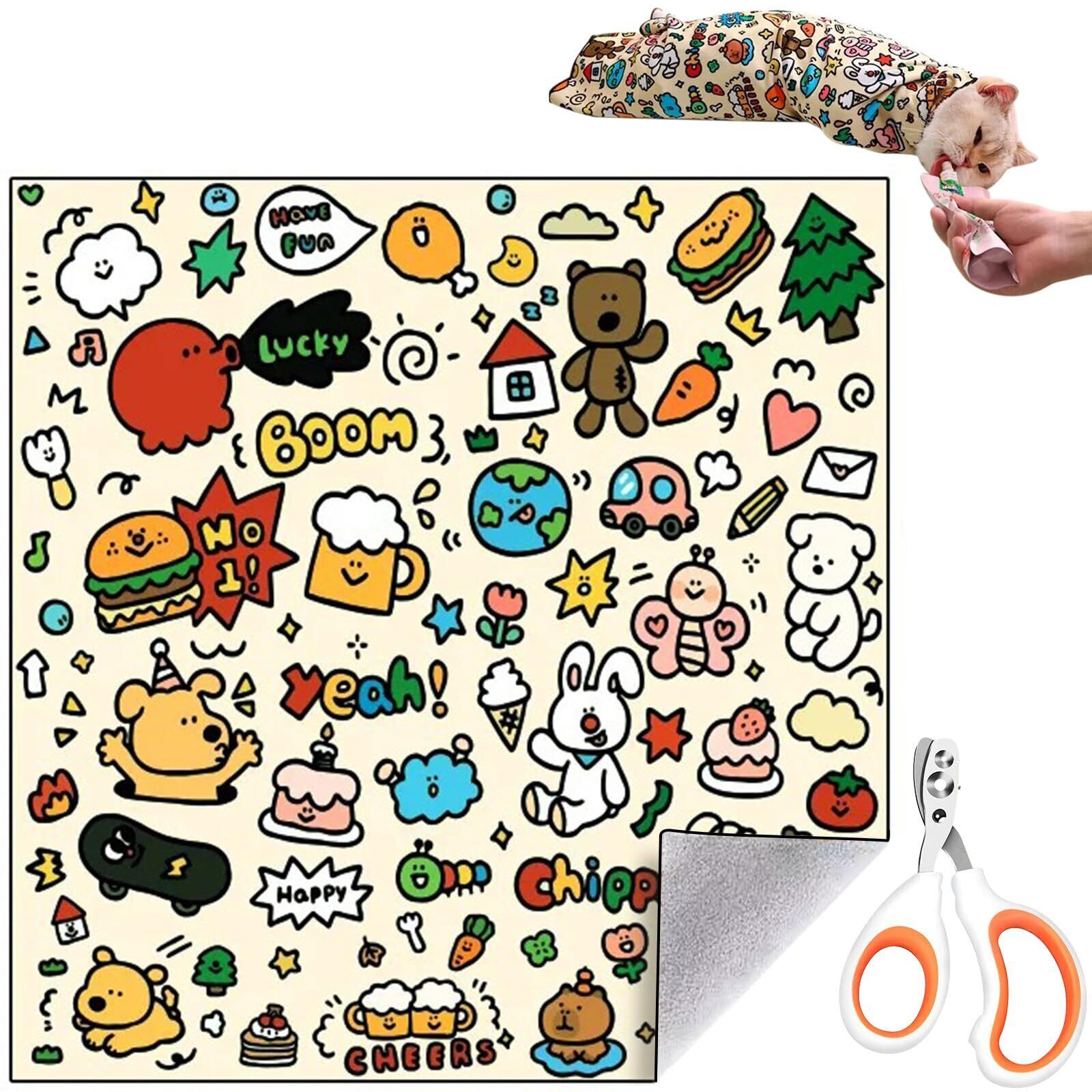 【商品仕様】パッケージ内容:猫グルーミングラップ×1、2穴ペット用爪切り×1 。サイズ:約55×55cm。カラー:ベージュ+かわいいイラスト柄。体重10kg以下の猫におすすめです。