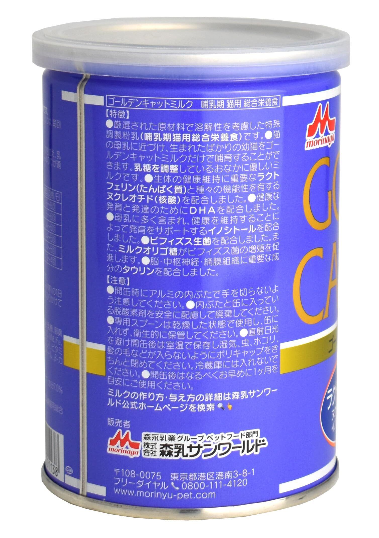 厳選された原材料で作られて幼猫(哺乳期・養育期)用の特殊調整粉乳(総合栄養食)です。成分を猫の母乳に近づけてありますので、生まれたばかりの幼猫をゴールデンキャットミルクで哺育することができます。乳糖を調整してあり、おなかに優しいミルクです。特殊な加工技術により、溶解性に優れています。生体の健康維持に重要なたんぱく質ラクトフェリンと、DNAの構成単位で種々の機能性を有するヌクレオチド(核酸)を配合しました。健康な発育と発達のためにDHAを配合しました。母乳に多く含まれ、健康を維持することによって発育をサポートするイノシトールを配合しました。ビフィズス生菌を配合しました。また、ミルクオリゴ糖がビフィズス菌の増殖を促進します。脳・中枢神経・網膜組織に重要な成分のタウリンを配合しました。