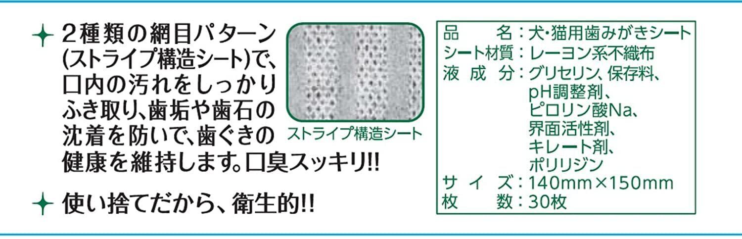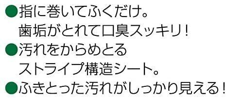 歯垢がとれて口臭スッキリ。汚れをからめとるストライプ構造シート。指に巻いてふくだけ。ふき取った汚れがしかっり見えて効果を実感。※2017年3月製造分より、製造ロットNOから使用期限印字へ外装表記を変更いたしました(西暦下2桁/月/日) 原材料・成分 レーヨン系不織布、グリセリン、保存料、pH調整剤、ピロリン酸Na、界面活性剤、キレート剤、ポリリジン