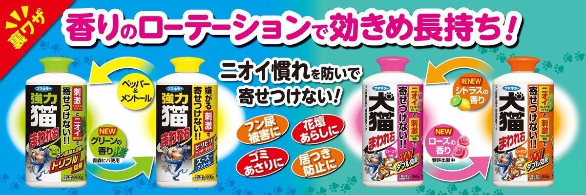 ●使用上の注意:●本品は食べ物ではありません。誤って食べた場合は医師の診療を受ける。 ●人やペットには薬剤をかけない。 ●本品は屋外専用です。室内ではニオイが残るので使用しない。 ●アレルギー症状やカブレなどを起こしやすい体質の人は、薬剤に触れないよう注意する。体調のすぐれない時は使用しない。 ●薬剤が水槽、池、川などに入らないよう注意する。 ●皮膚についた場合は直ちに石けんでよく洗う。 ●眼に入った場合はすぐに水洗いし、眼科医の手当を受ける。 ●使用中に身体に異常を感じた場合は、ただちに使用を中止し、医師の診療を受ける。 ●シミ・変色の原因となるので、自動車・門扉・シャッター・その他の塗装面や大理石等にはかからないよう注意する。かかった場合は直ちに洗い落とす。 ●効果の持続期間は天候や温度条件により異なります。 ●ニオイに対して鈍くなっているネコや、空腹・発情期の猫には効果が劣る場合があります。このような場合にはニオイによる忌避以外の対策が必要です。