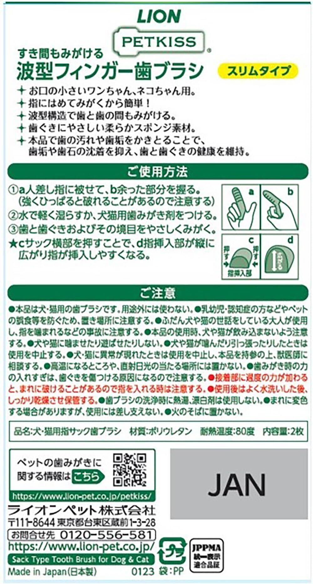 ライオン PETKISS すき間もみがける 波型フィンガー歯ブラシ スリムタイプ ペット用 2枚入