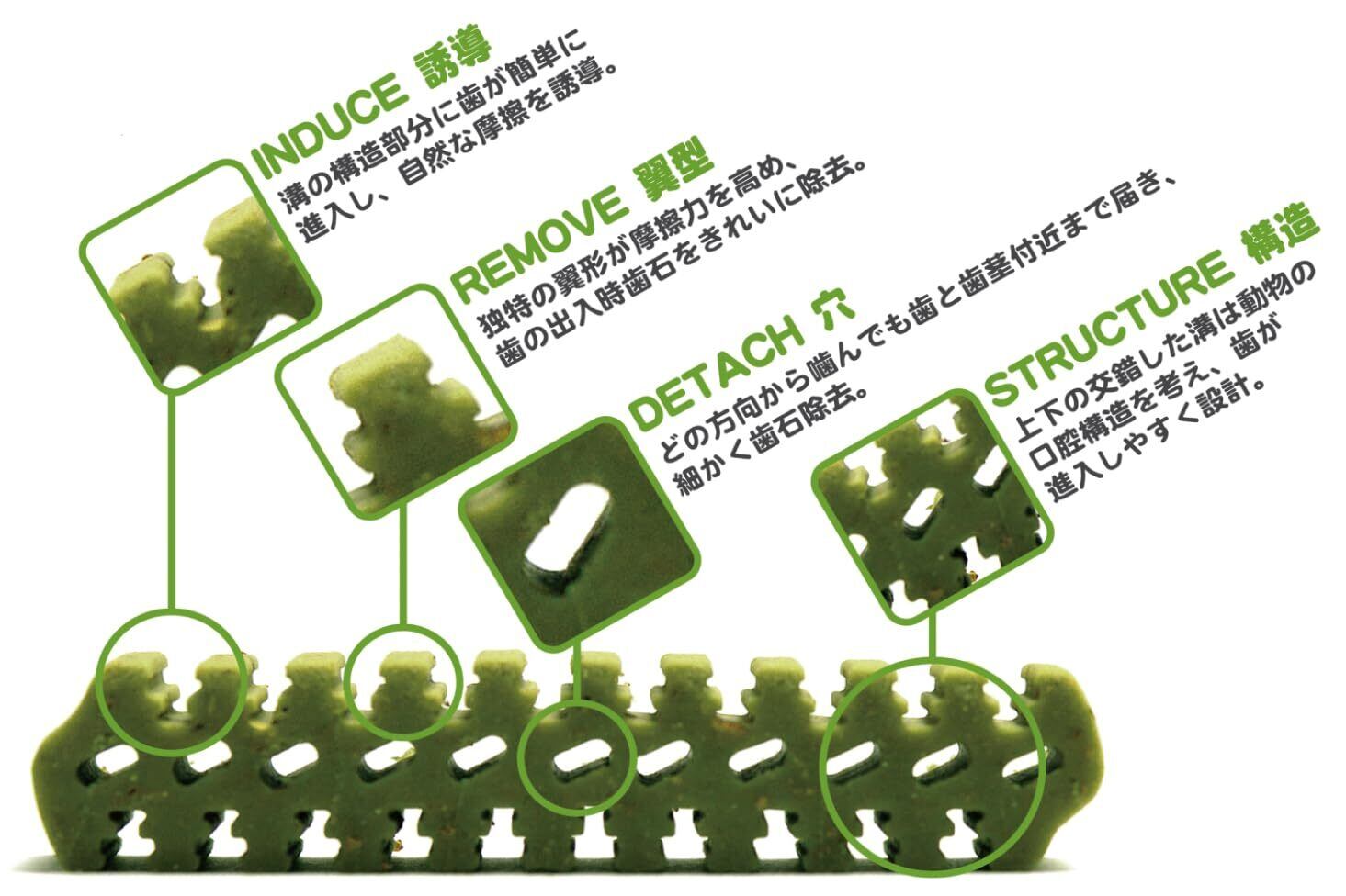 食べながら簡単デンタルケア! どこから噛んでも頑固な歯垢をやさしくスケーリング! 消化&快便サポート! クロレラ、ビタミンをミックス配合! 噛むことで歯垢をよりはやく取り除くため、どこから噛んでも歯茎までしっかり届く設計です。