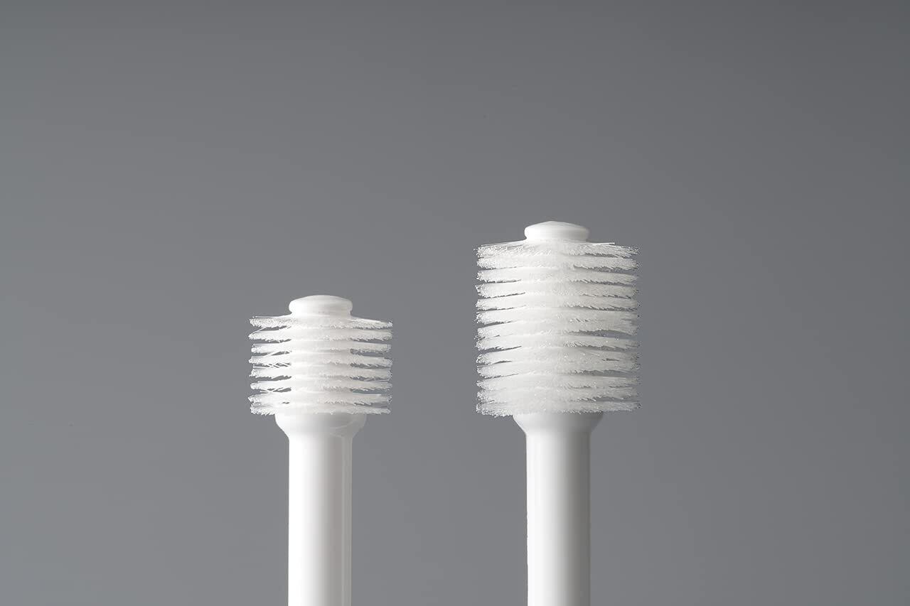 ブラシヘッドが筒形なので角度を歯面に合わせなくても、毛先が必ず歯にあたるので、ブラシを当てれば磨くことができます。 また、毛の密度が高いので、毛細管現象でヨゴレがブラシ部に吸着します。