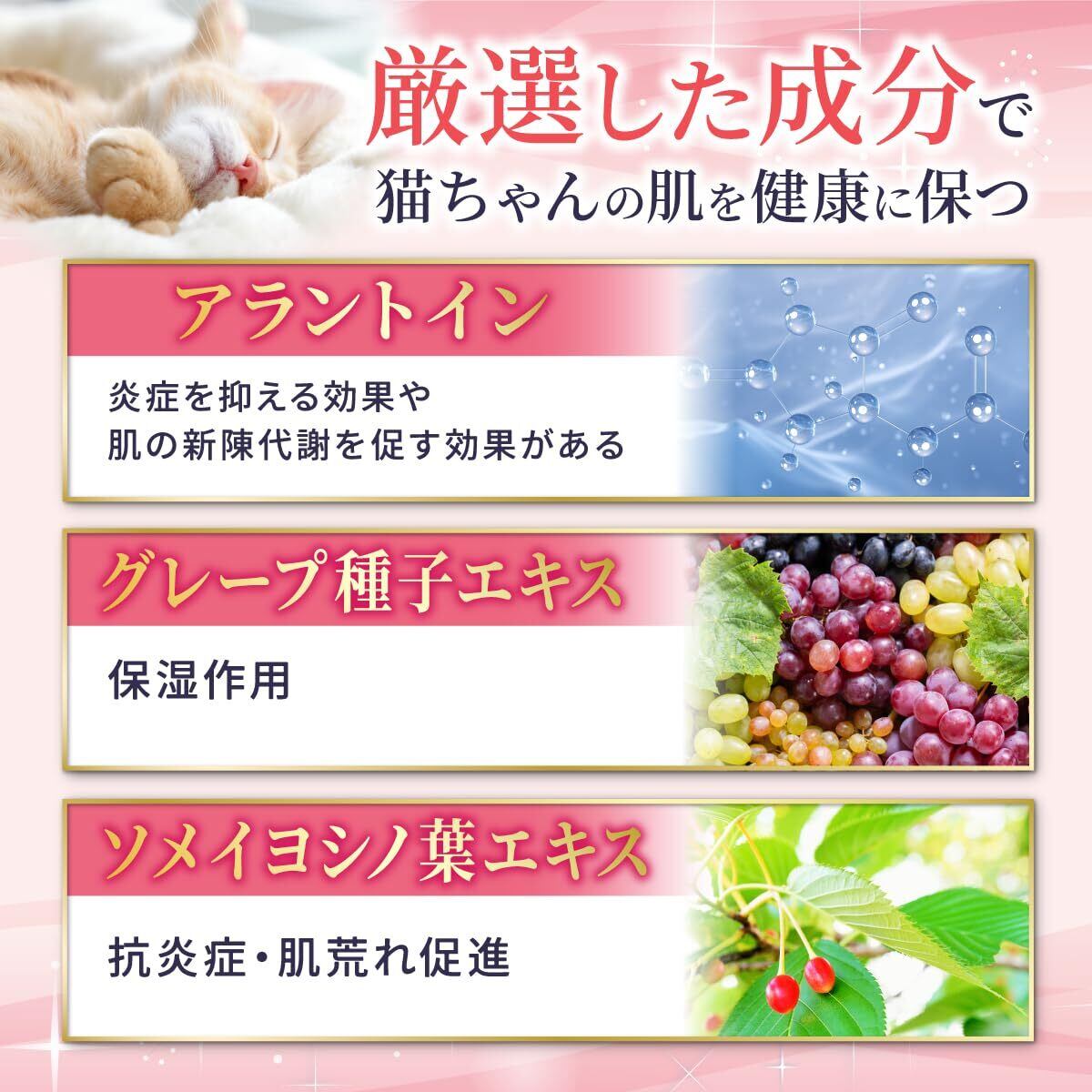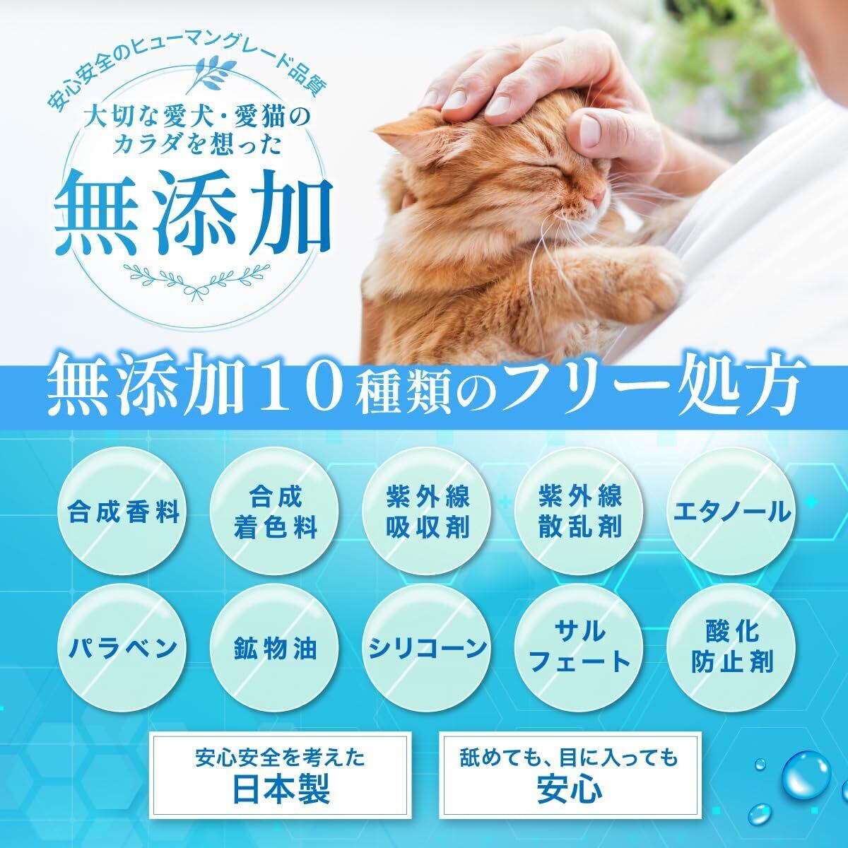 【べたつかない使用感】べたつきを気にしてしまう猫ちゃんのために、べたつかない使用感にしました。使用後に洗い流したり再度拭きなおす必要はありません