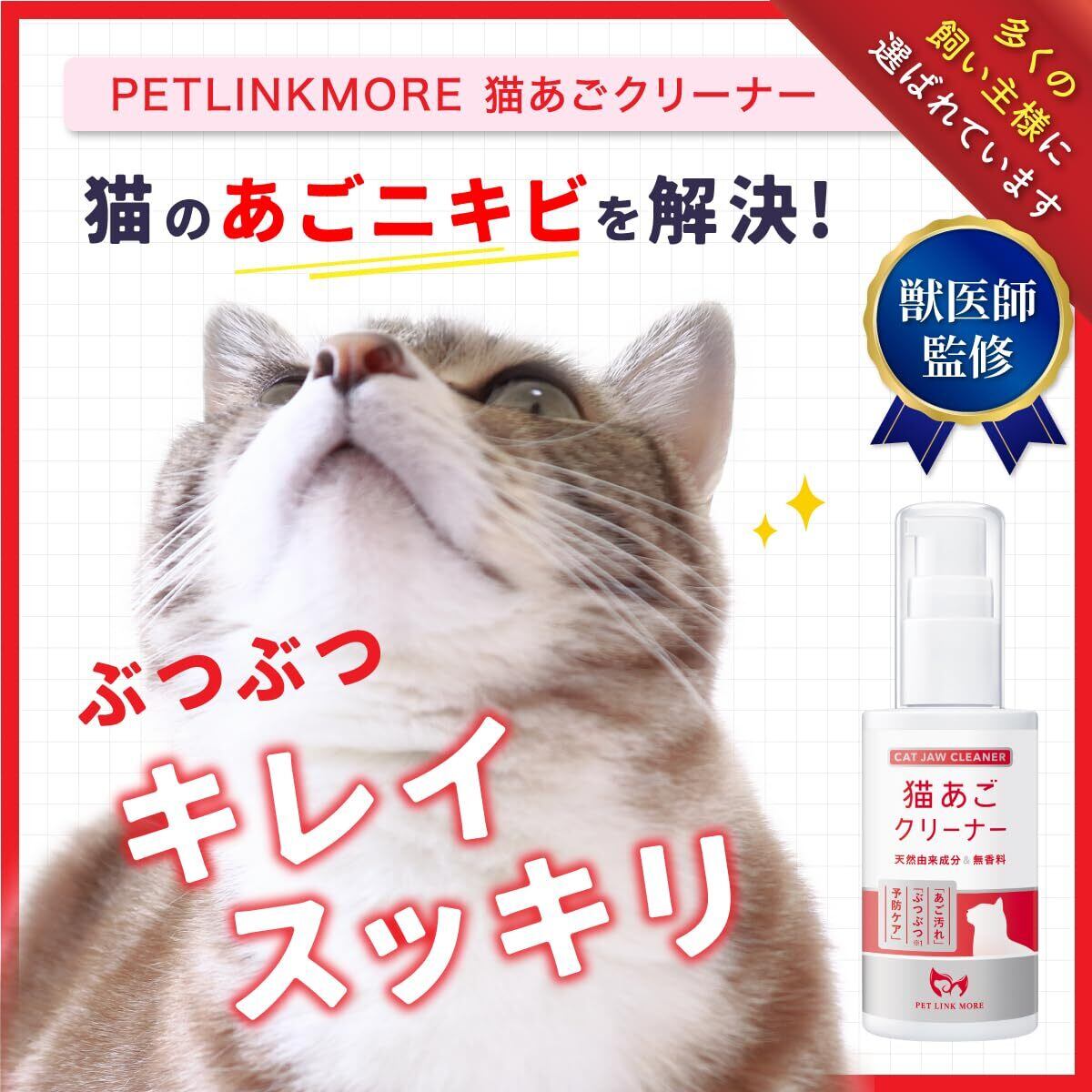 【獣医師監修製品】PETLINKMOREの猫あごクリーナーは獣医師監修の製品。やさしく、しっかりあごニキビを落とします
