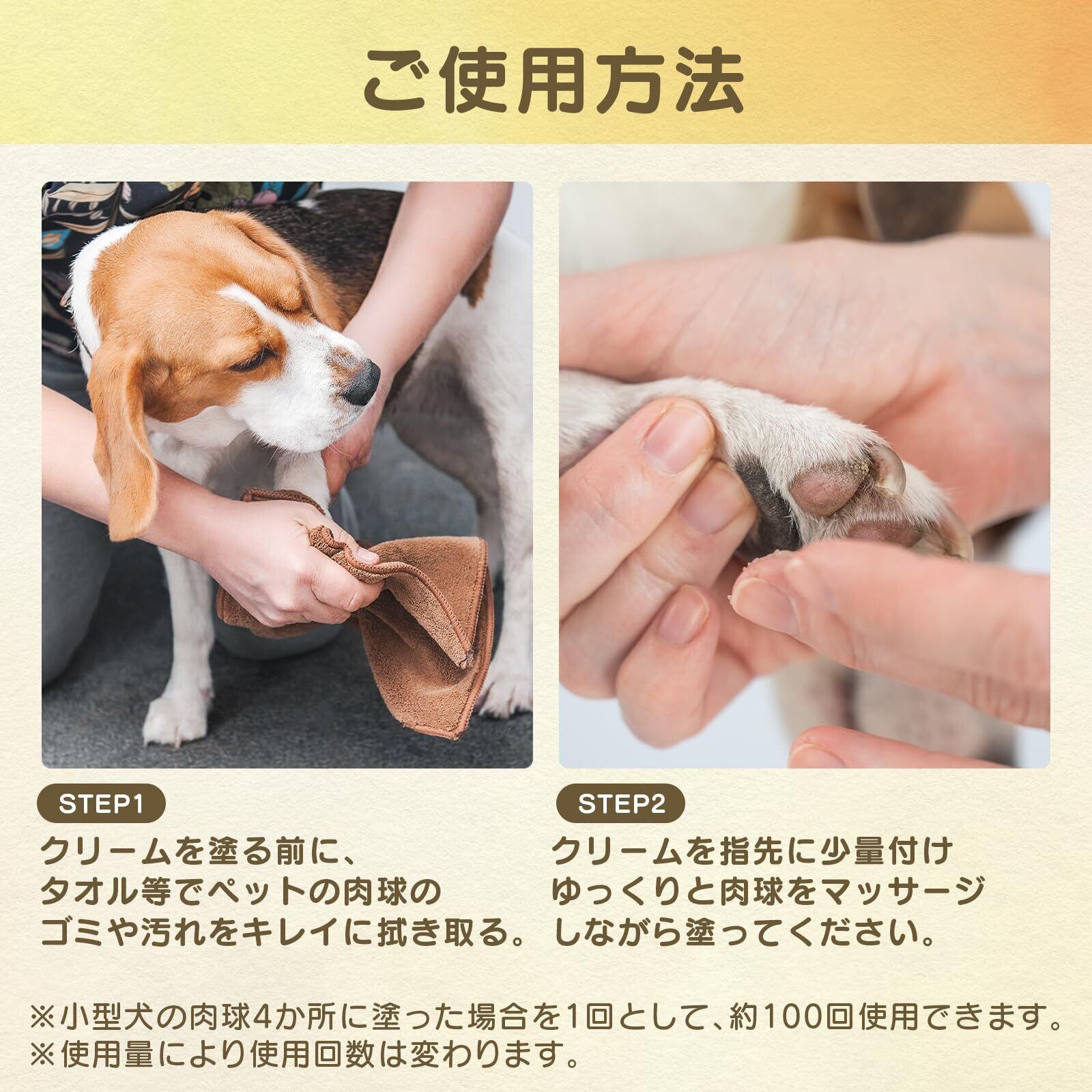 クリームを指先に少量付けゆっくりと肉球をマッサージしながら塗ってください。 ※小型犬の肉球4ヶ所に塗った場合を1回として約100回使用できます。 ※使用量により使用回数は変わります。