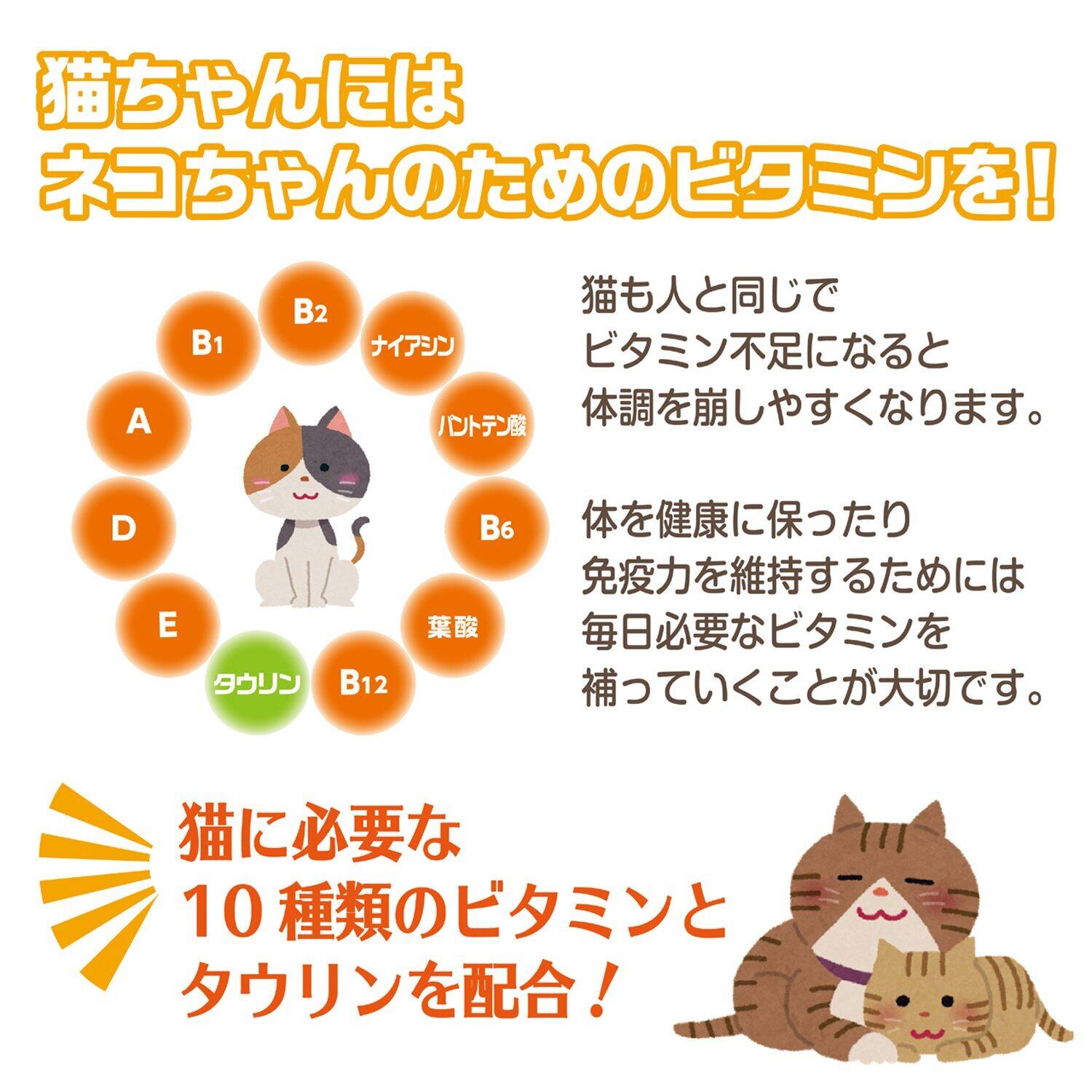猫の健康維持と栄養補給に必要な10種類のビタミンを配合しています。猫に必要なアミノ酸誘導体のタウリンを強化しています。