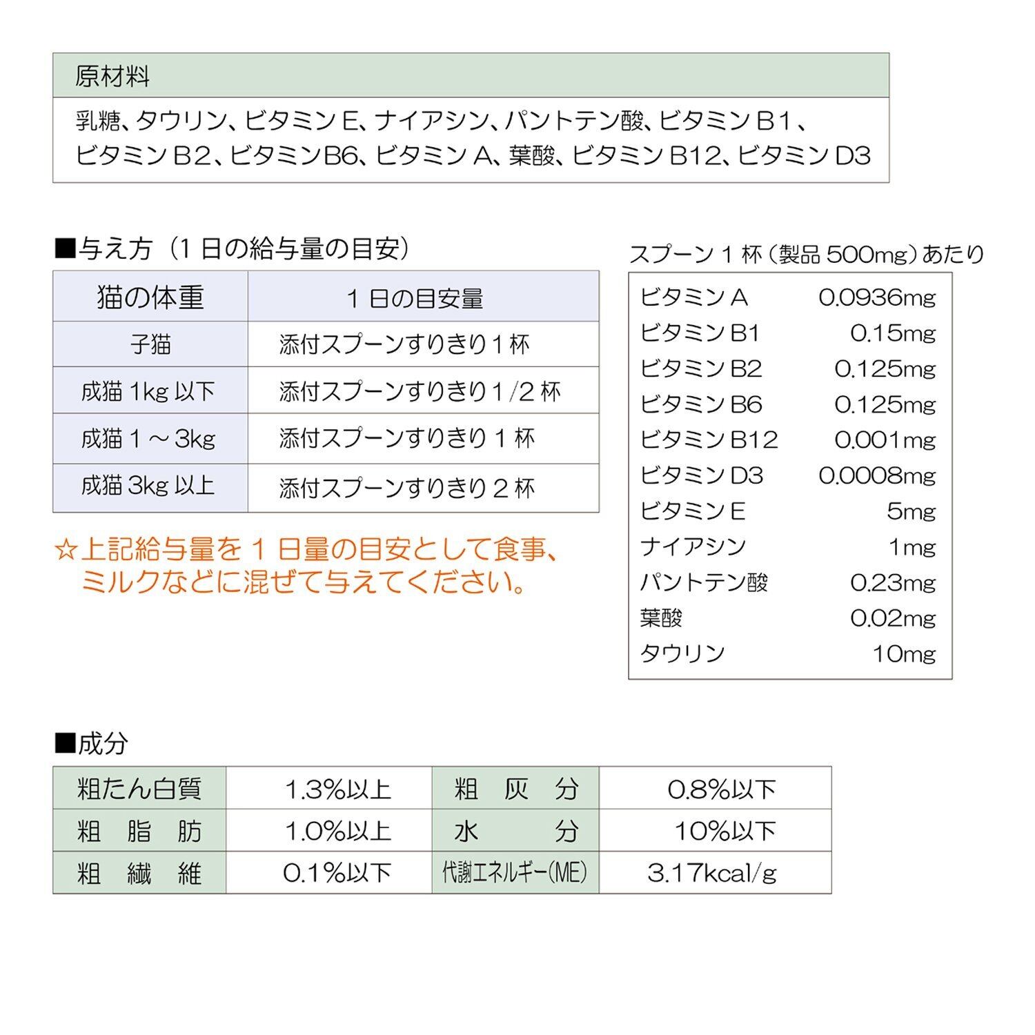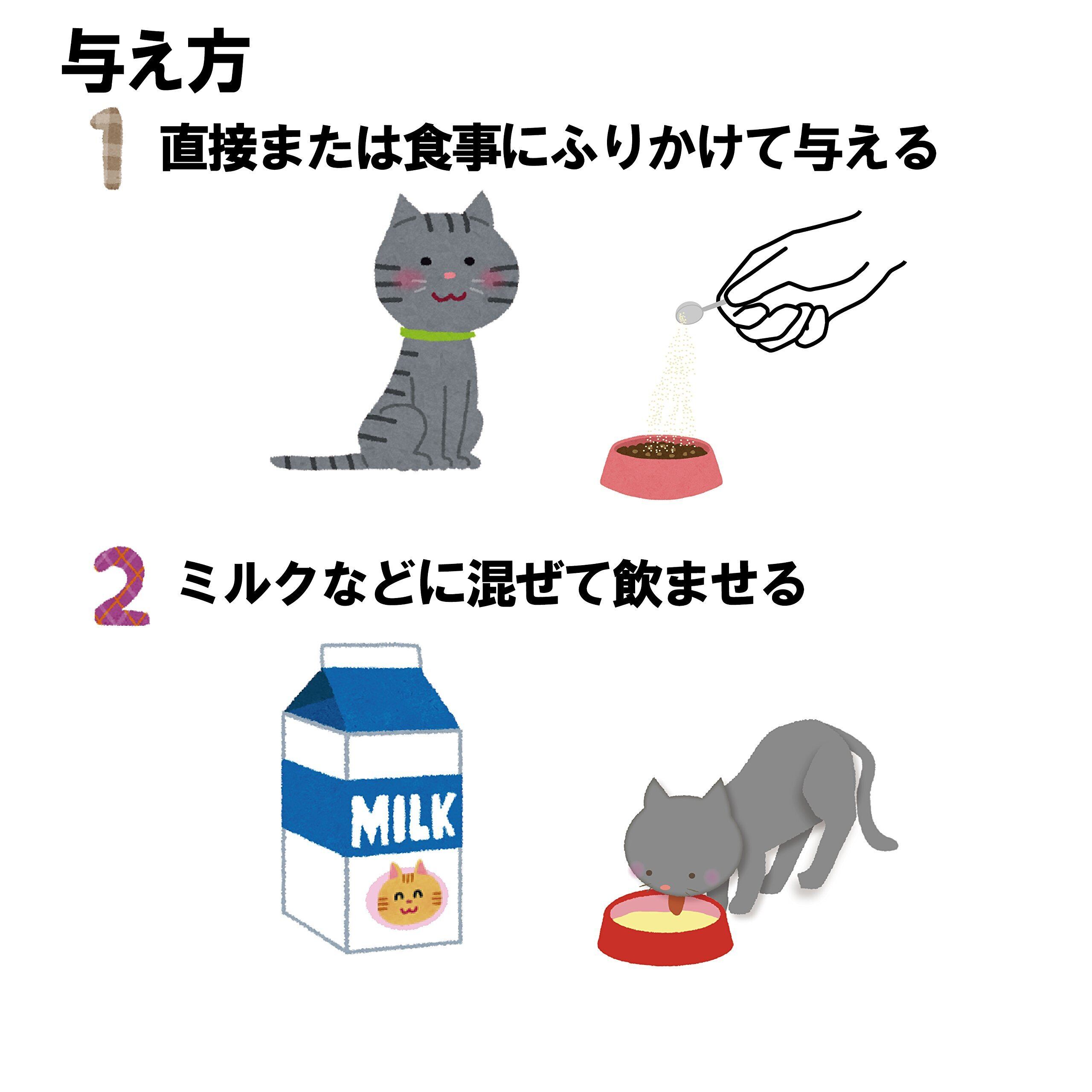 与え方 子猫:添付スプーンすりきり1杯 成猫(1kg以下):添付スプーンすりきり1/2杯 成猫(1~3kg):添付スプーンすりきり1杯 成猫(3kg以上):添付スプーンすりきり2杯 この量を目安として食事、ミルクなどに混ぜて与えて下さい。※添付スプーンはすりきり1杯で0.5gです。