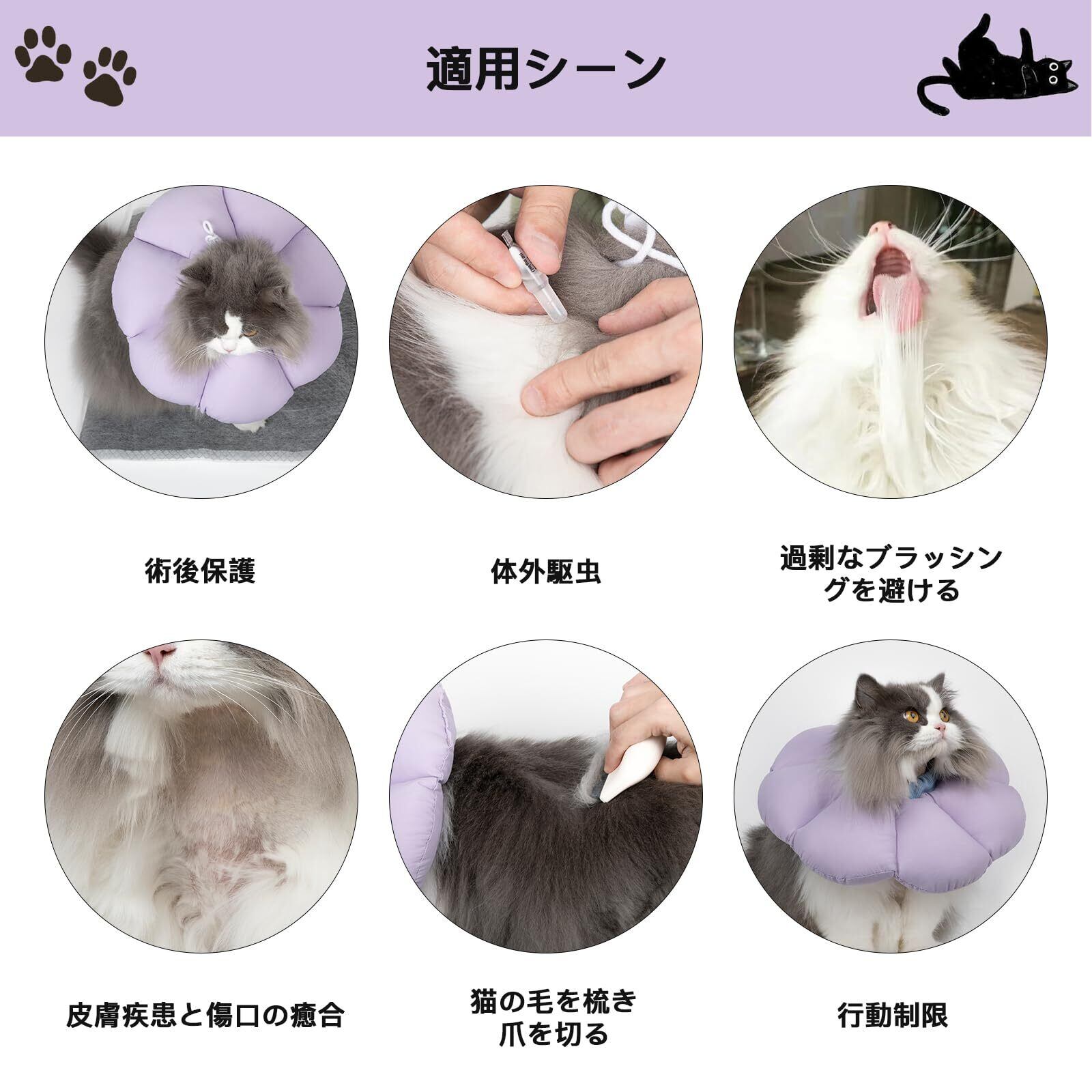 「病後の回復を早める」猫エリザベスカラーは、術後の傷口の保護、かぶれや術後の傷の保護、ペットがケガや手術した部位を噛んだり舐めたりするのを防ぎ、手術や傷の回復を促します、また、外部駆虫、皮膚科の傷の治療、爪切り、猫の毛のグルーミングなど、日常的に使用される。