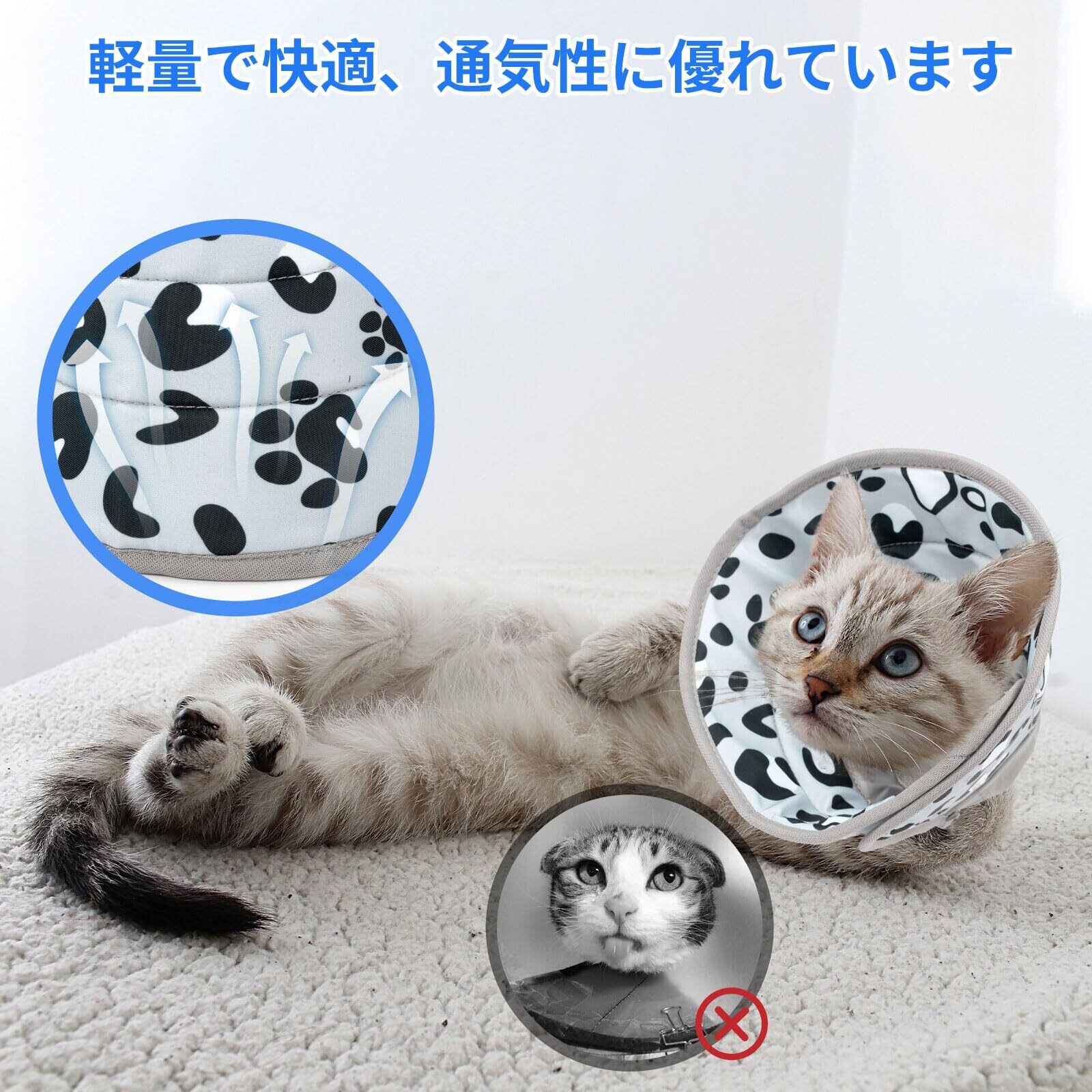 【調節可能なエリザベスカラー】:エリザベスカラー猫は、ペットの首のサイズに合わせて調節できる伸縮性のあるバンドデザインを採用しており、快適な使用感を実現します。ベルクロ留めが付いているので、猫のエリザベスカラーが簡単に外れることがありません。