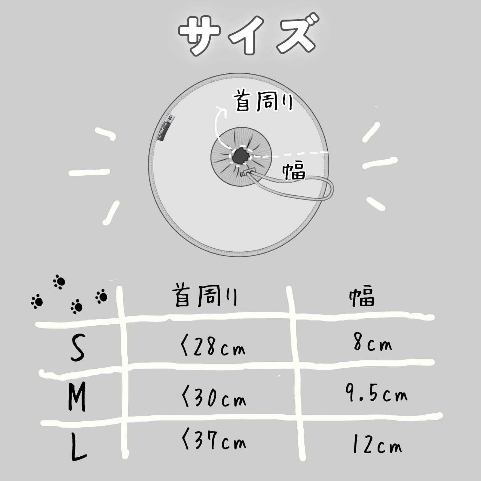 Sサイズ(首周り:22-28cm、幅:8cm)体重1-2.5kgくらいのわんちゃんネコちゃんにピッタリ!Mサイズ(首周り:28-30cm、幅:9.5cm)体重2-3.5kgくらいのわんちゃんネコちゃんにピッタリ!Lサイズ(首周り:31-39cm、幅:12cm)体重3.5-7.5kgくらいのわんちゃんネコちゃんにピッタリ!