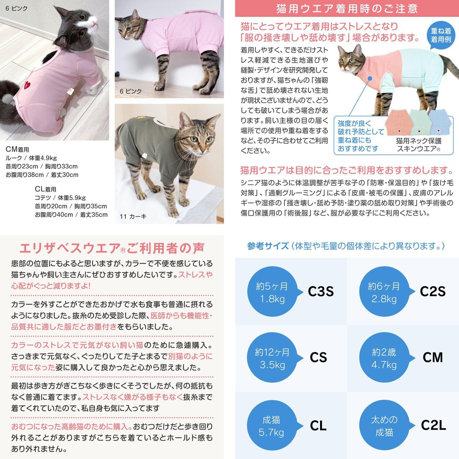 なぜ猫に服を着せるの? 自由を好む猫にとって、服を着ることはストレスになることもあります。 しかし、手術後の傷口を舐めるのを防いだり、皮膚トラブルや介護の際には、服が治癒を助けて生活を快適にします。 フルオブビガーは長年にわたり猫の習性や動きを研究し、「猫が嫌がらずに着てくれる服」を追求。多くの猫と飼い主さんに支持されています。