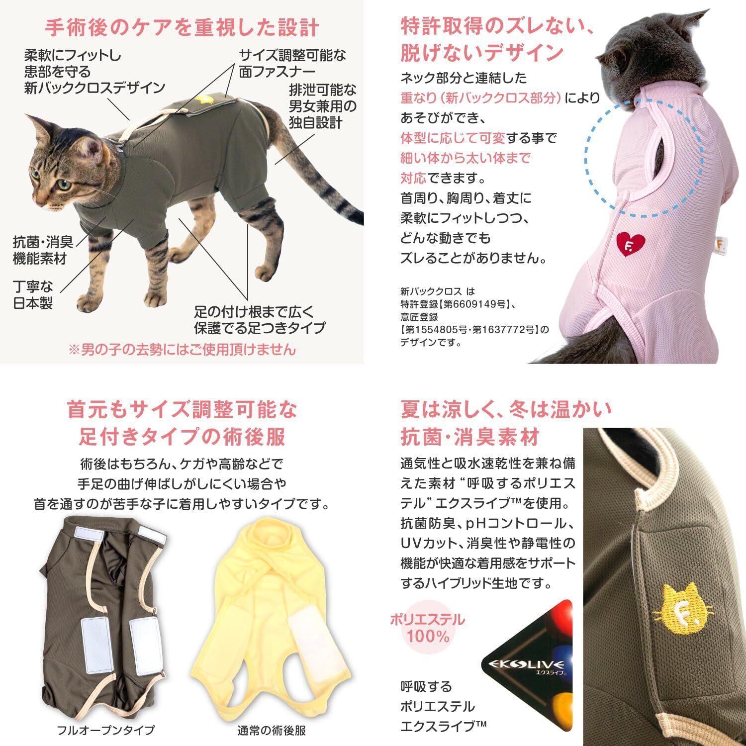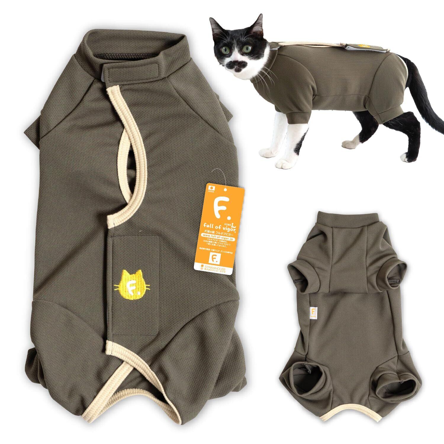 猫服 着脱簡単 フルオープン 傷口舐め対策 術後服 エリザベスウエア 男女兼用服 猫の服 フルオブビガー 11/カーキ C3S