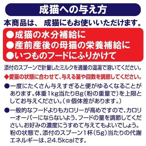 猫用ミルクよく溶けて使いやすい。母乳と同等の優れた栄養バランスで子猫を健康に育てます。成猫の栄養補給にも最適子猫の成長に必要な栄養をすべて含む調整粉乳。さらに溶けやすくなりました。タウリン強化。