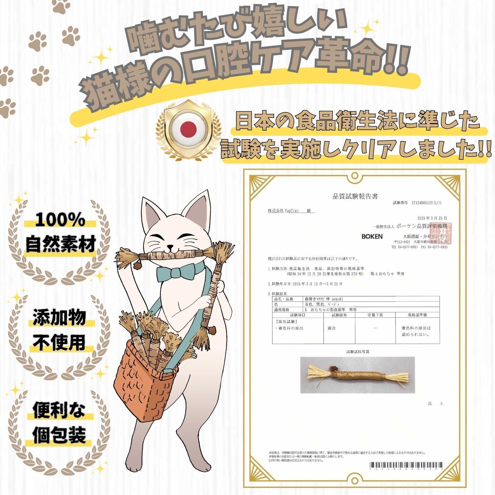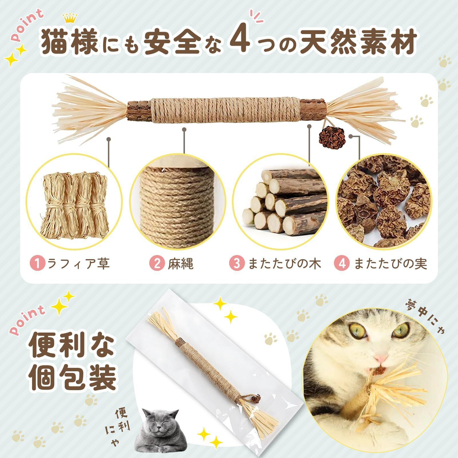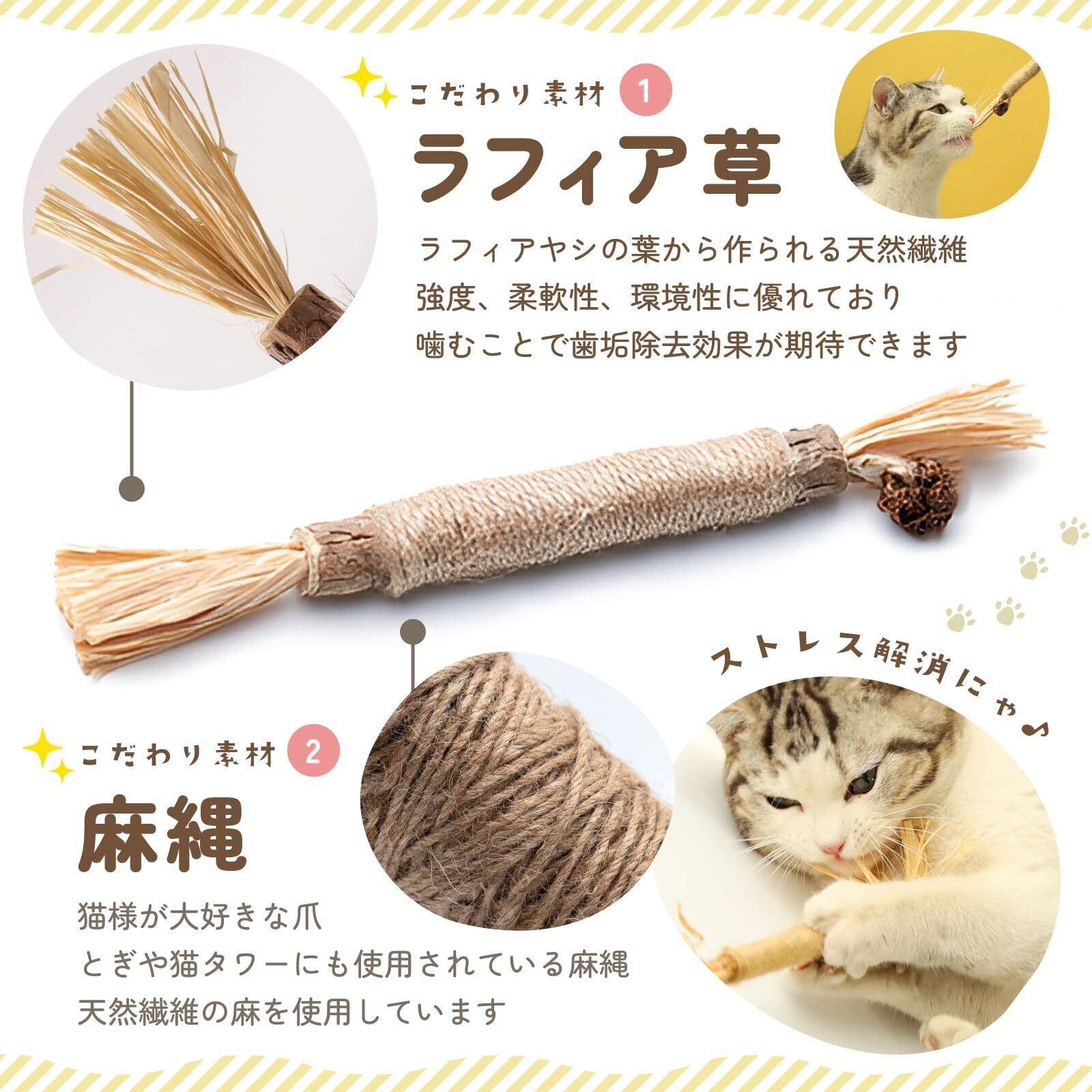 【天然素材100%】またたびやラフィア草など、化学添加物不使用の 天然素材100% で安心・安全に使用できます。