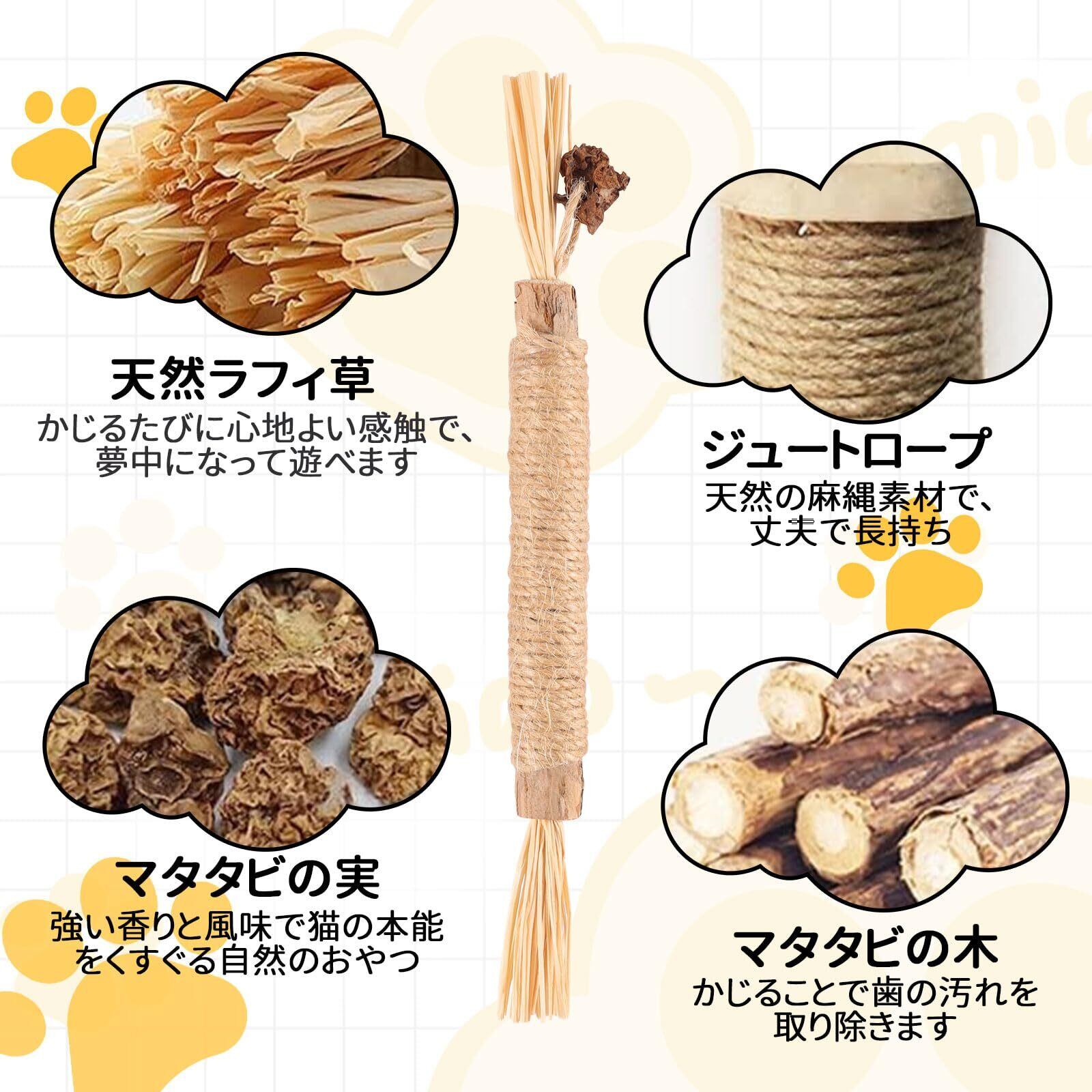 「 天然素材でできた猫おもちゃ」天然ラフィア草・ジュートロープ・マタタビの実と木といった自然素材で作られており、猫が口にしても安心できる素材です。強いまたたびの香りと風味で猫の本能をくすぐる噛むおもちゃです。