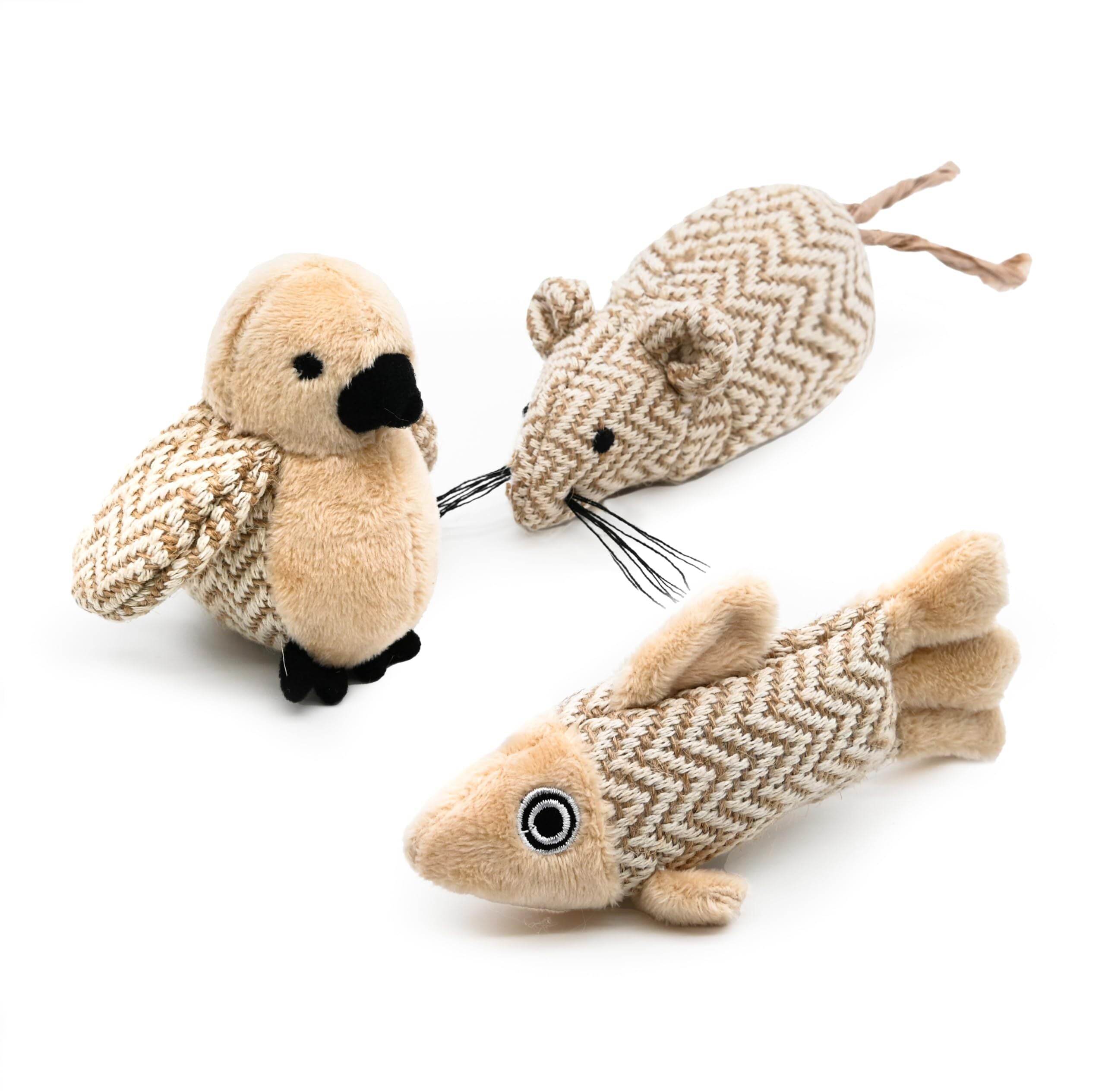 猫のネズミのおもちゃ 天然の麻材料 ネズミと魚と小鳥 フルーツいぐるみ 猫用玩具 猫遊び 噛むおもちゃ 運動不足解消 ストレス解消 (3個入,ネズミ+魚+鳥)