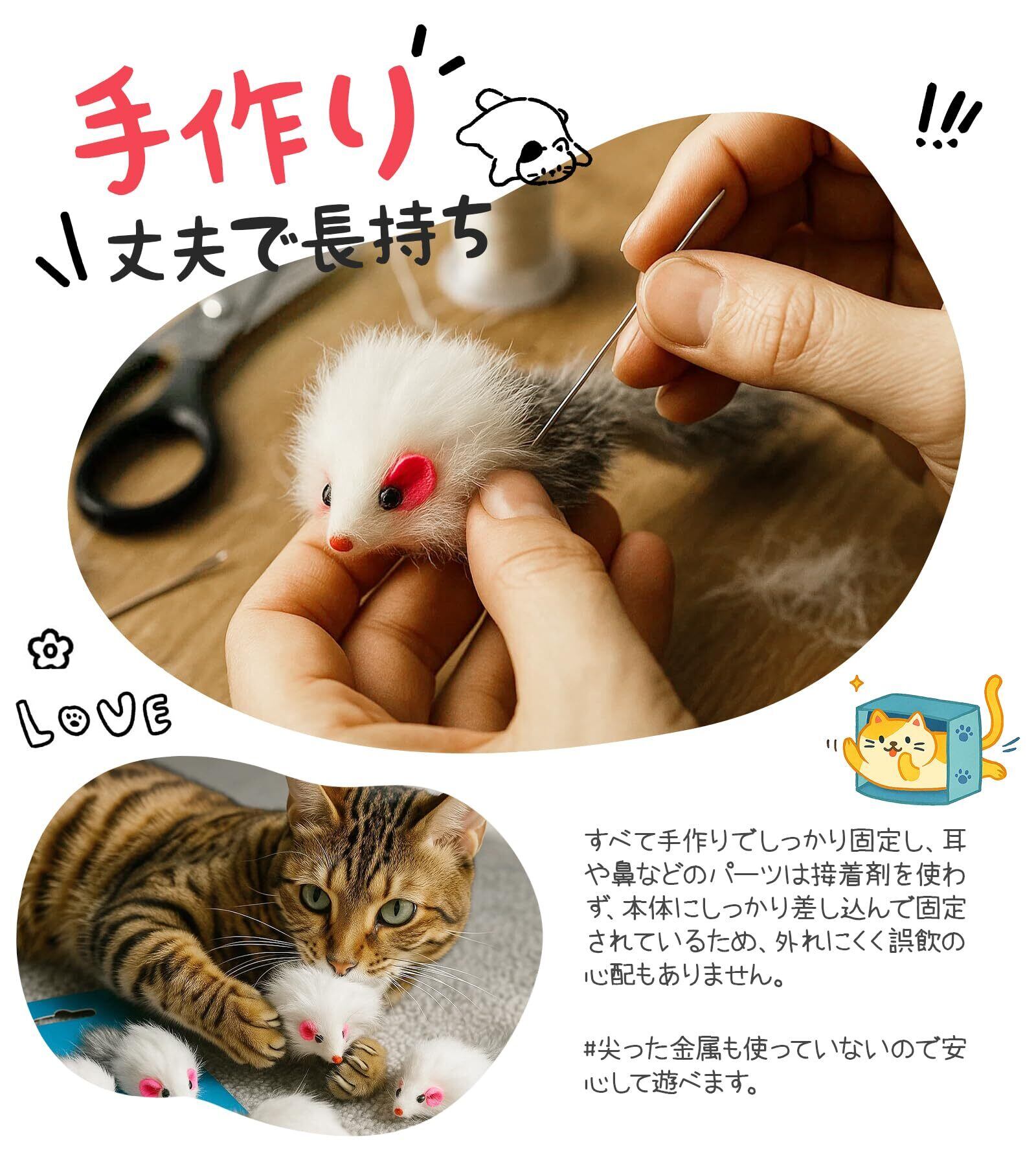 【リアルな質感で猫の狩猟本能を刺激】 ねずみ型の毛玉は、本物の小動物のような柔らかさと動きで、猫の狩猟本能を引き出します。噛んだり追いかけたり、飽きずに遊べる設計です。