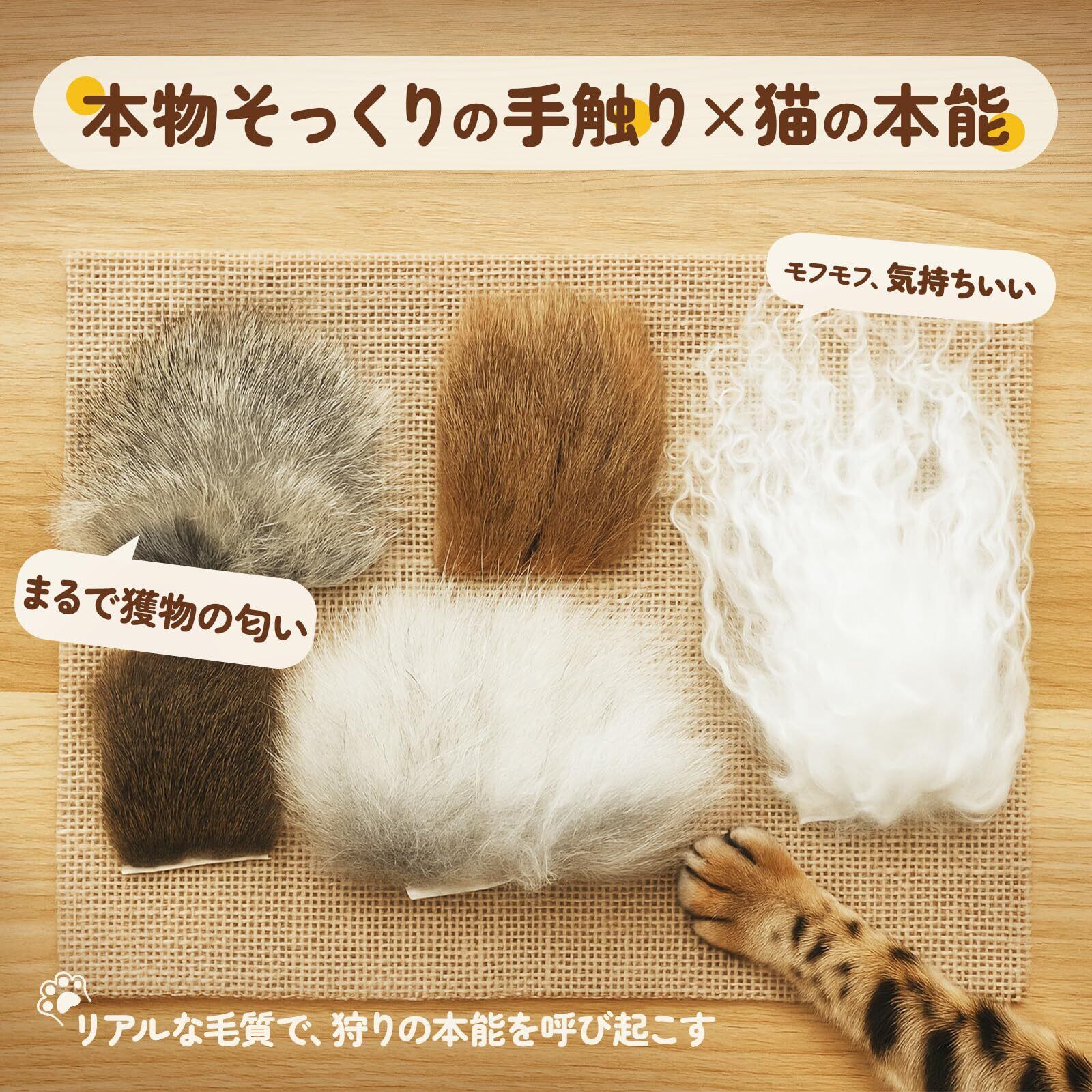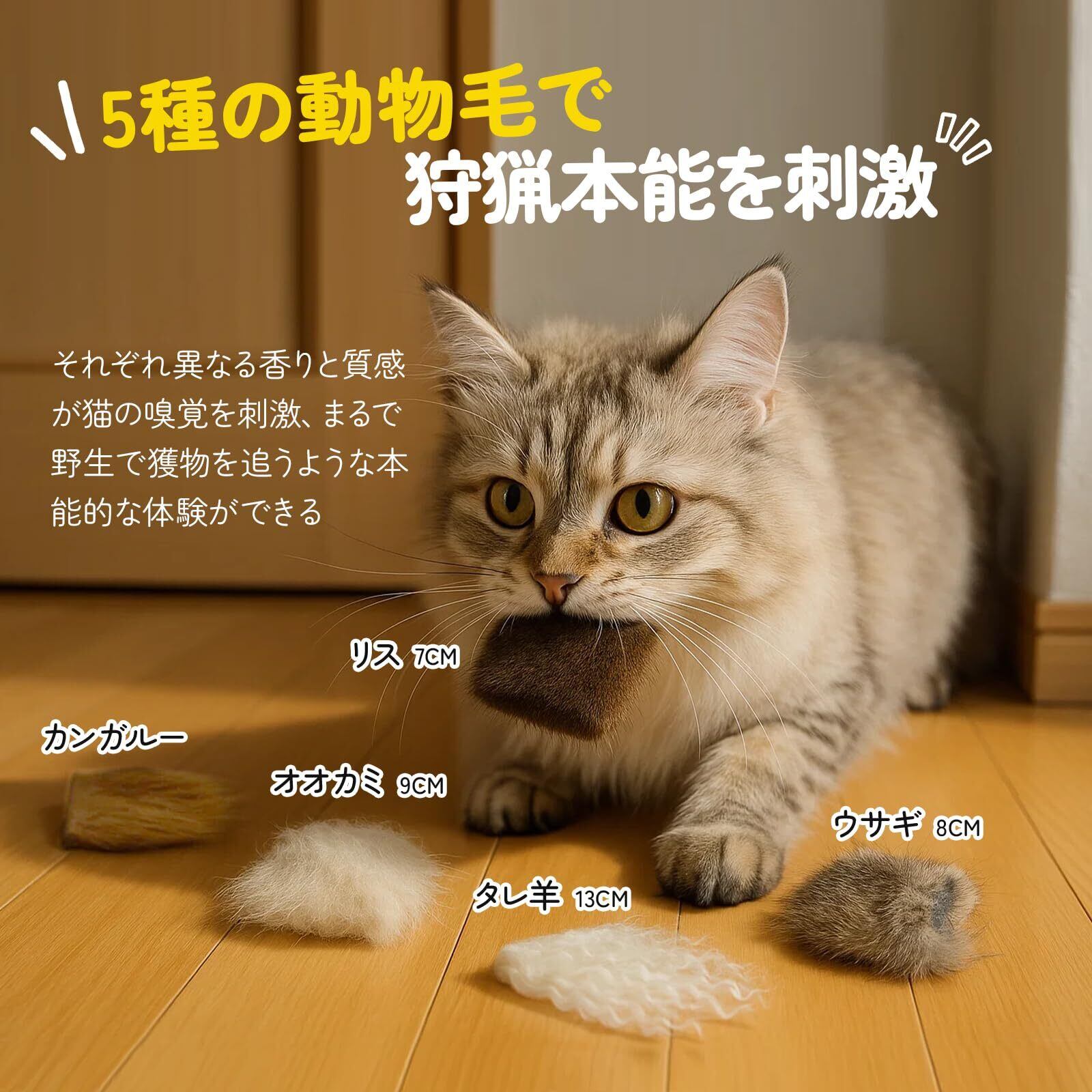 【室内でも狩猟本能を刺激】 猫知育玩具はウサギ・リス・カンガルー・オオカミ・タレ羊の5種の天然動物毛を使用し、それぞれ異なる香りと質感が猫の嗅覚を刺激します。室内にいながら、まるで野生で獲物を追うような本能的な体験ができます。子猫、成猫、老猫にも適合します。