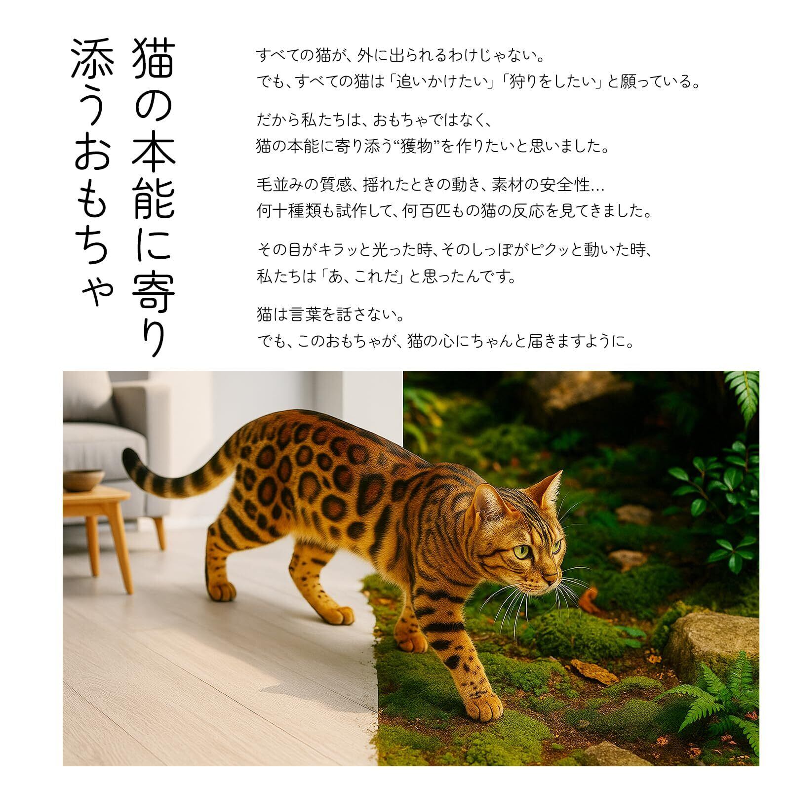 【運動不足・ストレスの解消に】 嗅ぐ・蹴る・追いかけるといった自然な動きを促す設計で、室内飼いの猫にもぴったりです。猫のおもちゃは日々の退屈を和らげ、ストレス解消や運動不足の改善に役立ちます。