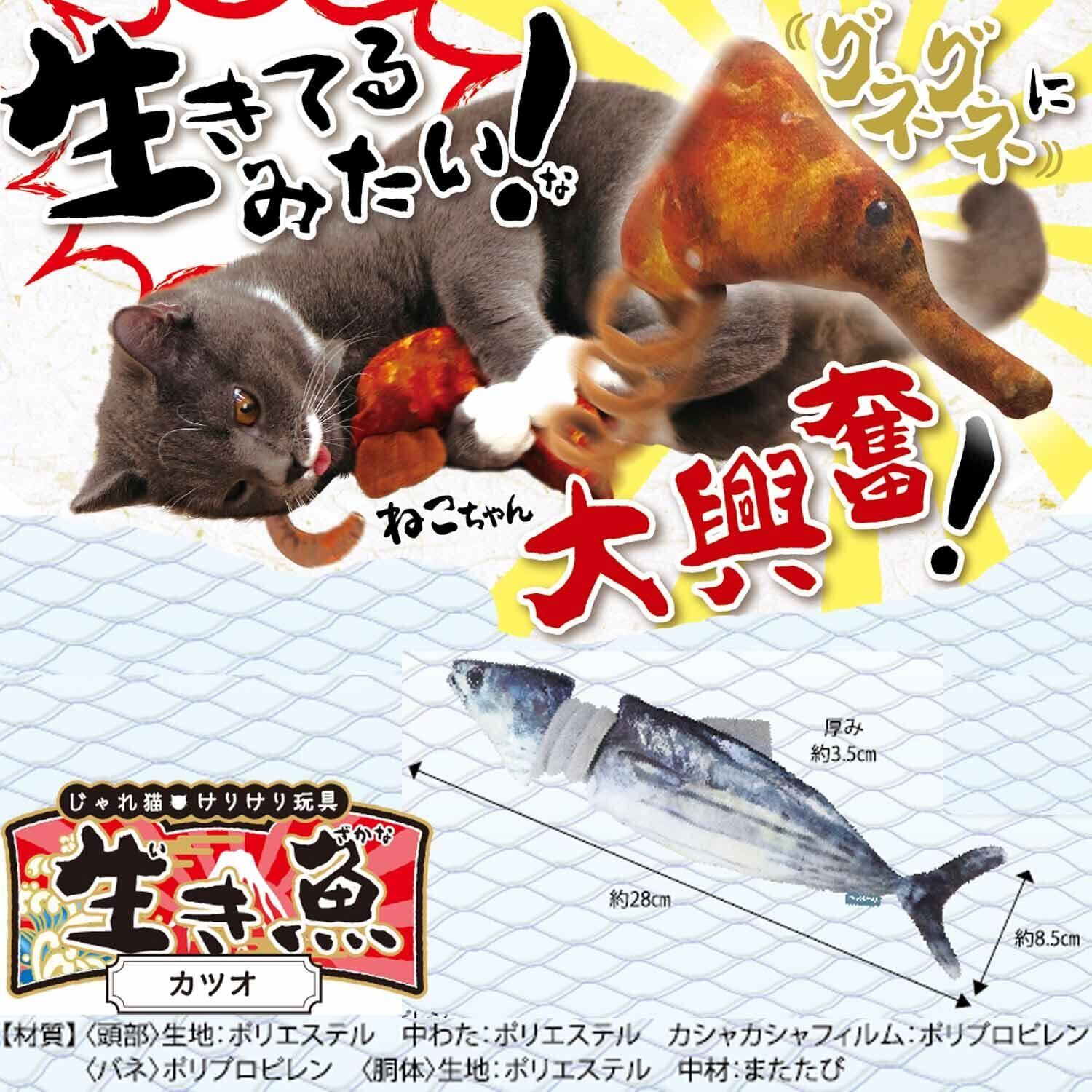 ●グネグネ生きてるみたいに動くから、猫ちゃんが夢中になって抱えて蹴って遊ぶぬいぐるみおもちゃ。●胴体部分には中身全部にたっぷりのまたたび入り。またたびの香りが猫ちゃんを魅了する。●首部分がバネ仕様で蹴るとまるで生きているように動き、猫ちゃんを挑発する。●頭部分は、音が鳴るカシャカシャフィルム入り。カシャカシャ音に猫ちゃんも夢中に。●ピチピチ暴れるカツオにそっくりなリアルプリントけりけりぬいぐるみおおちゃ。【材質・原材料】頭部:ポリエステル、ポリプロピレン、首部:ポリプロピレン、胴体部:ポリエステル、またたび