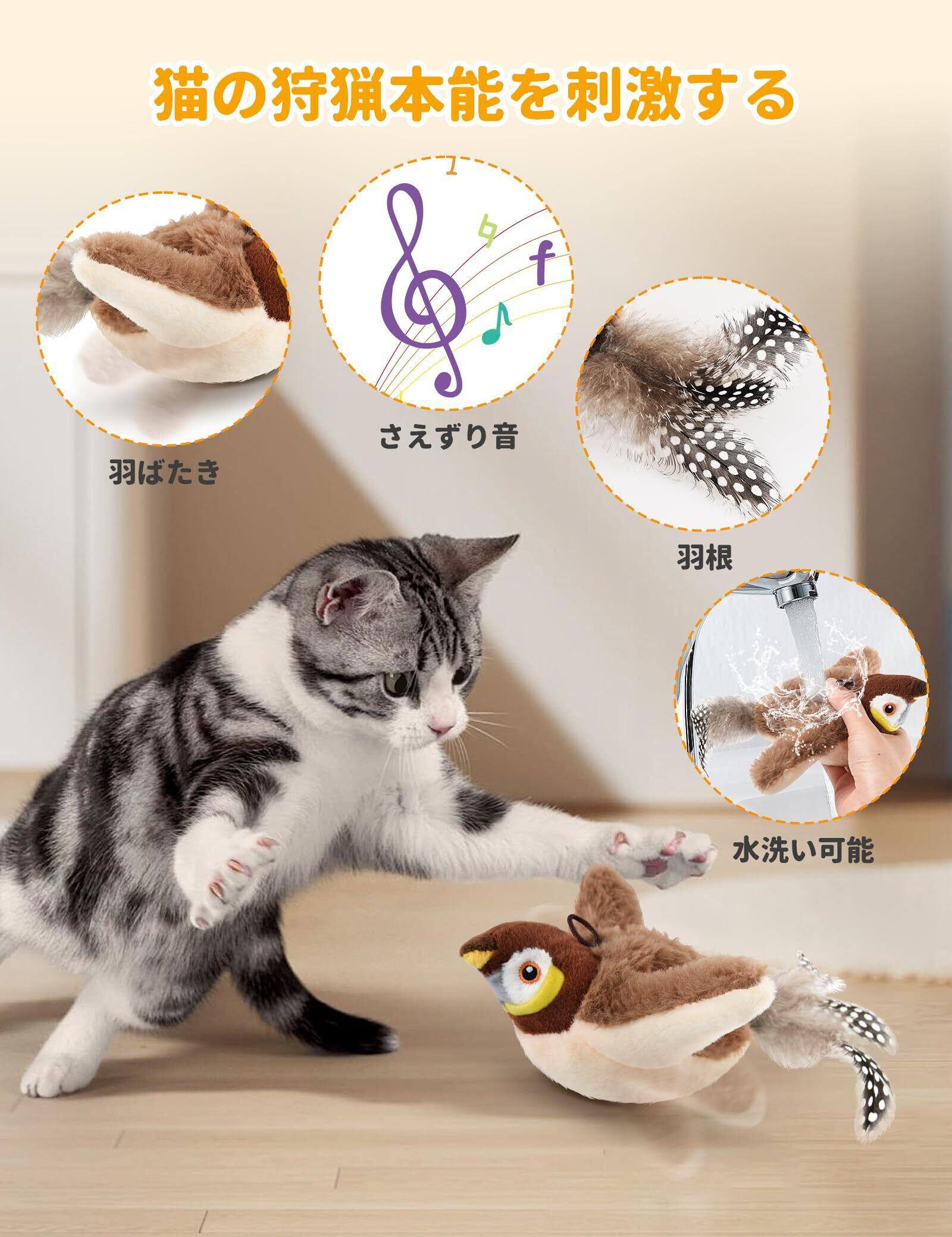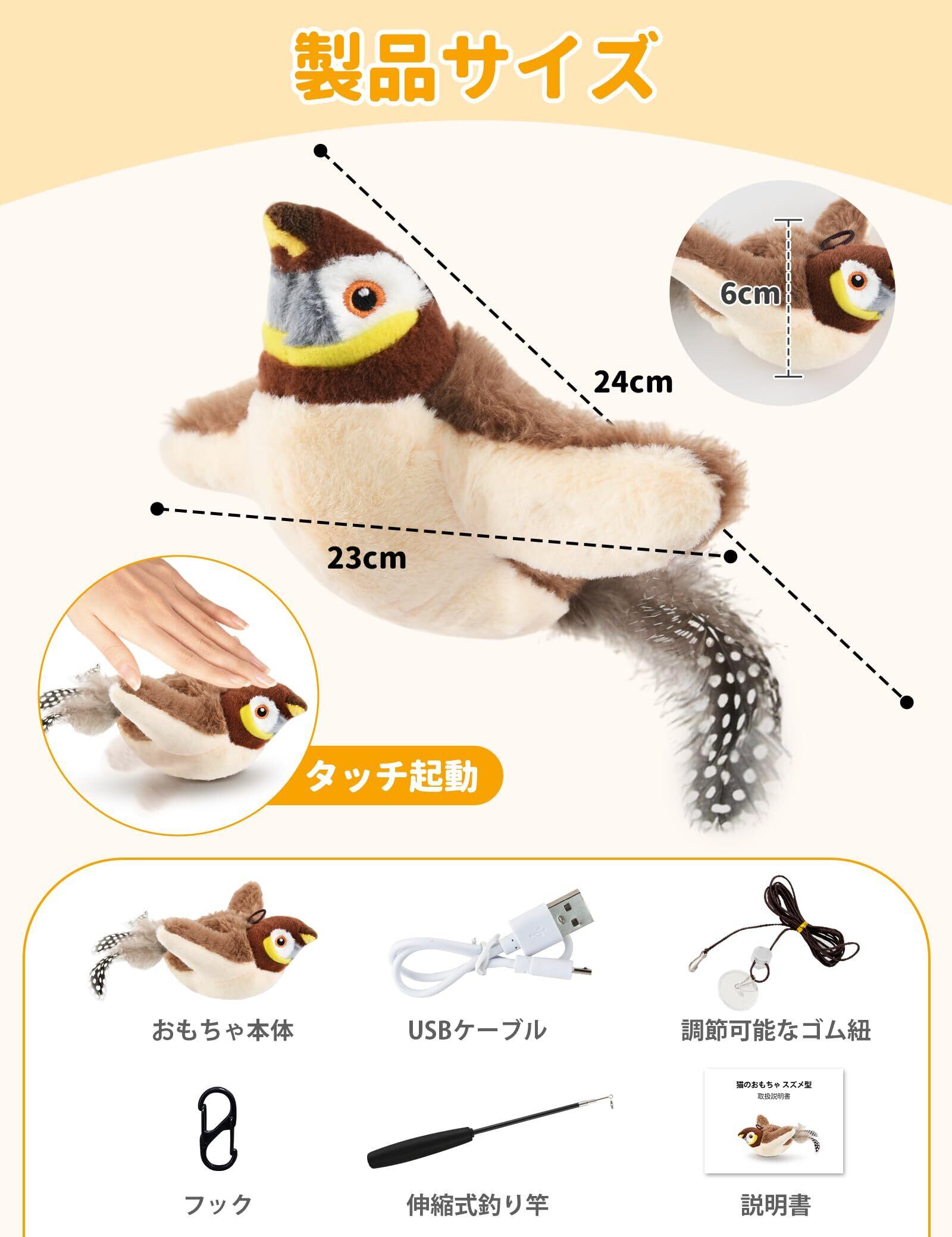 猫 おもちゃ 自動 羽ばたき鳥 猫じゃらし 一人遊び タッチ起動 鳴き声 猫玩具 吊り下げ式 釣り竿付き 運動不足解消 スズメ ぬいぐるみ 水洗い可能 ネコオモチャ USB充電