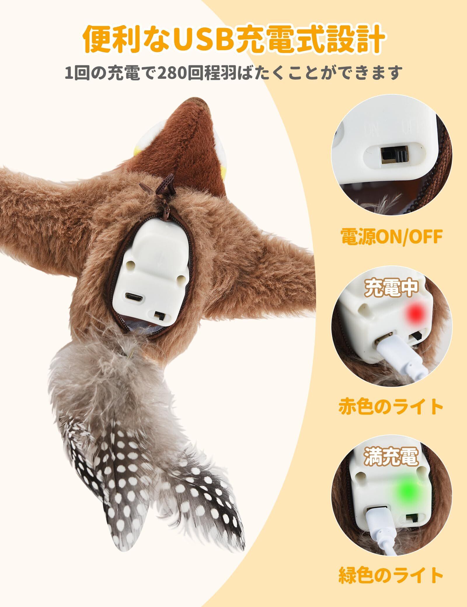 「USB充電式」便利なUSB充電式設計で、電池交換の手間と費用を節約できます。 1回の充電で200回程羽ばたくことができます。また、充電時には赤と緑のライトが点灯します。 当社の猫おもちゃにはUSBデータケーブルが付属しています。