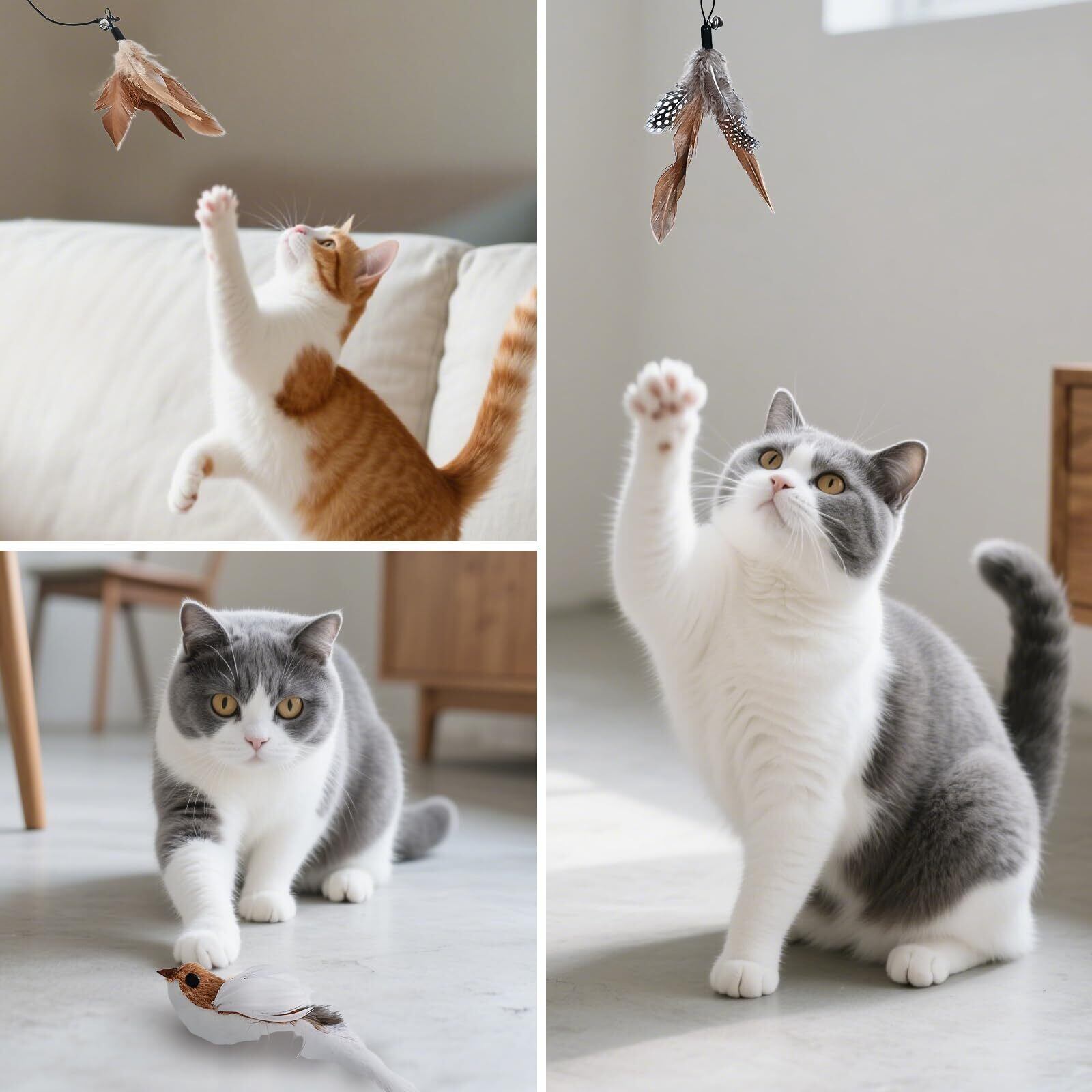 【猫じゃらし】天然の羽で作った小鳥、猫ちゃんの好みによって、じゃらしを取り替えることができます。愛猫はきっと夢中になるはずです。