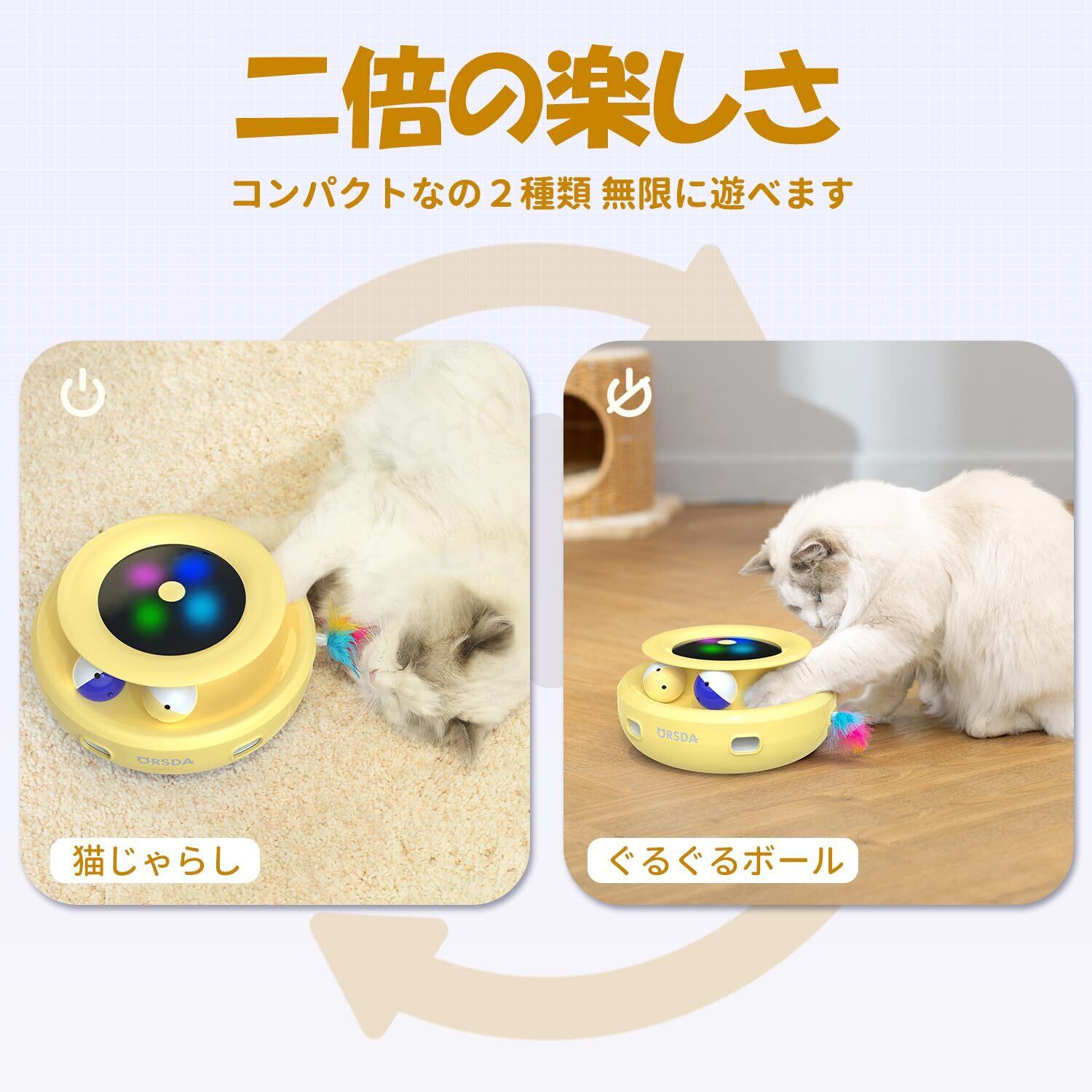 新T60Y 猫おもちゃ 電動 ORSDA 猫じゃらし 自動 猫ボール 2in1一体式 6本取り替え人工毛付 一人遊び猫おもちゃ自動 スピード調整可能 寂しさ解消/運動不足対策 狩猟天性満足 猫大興奮 説明書付 イエロー