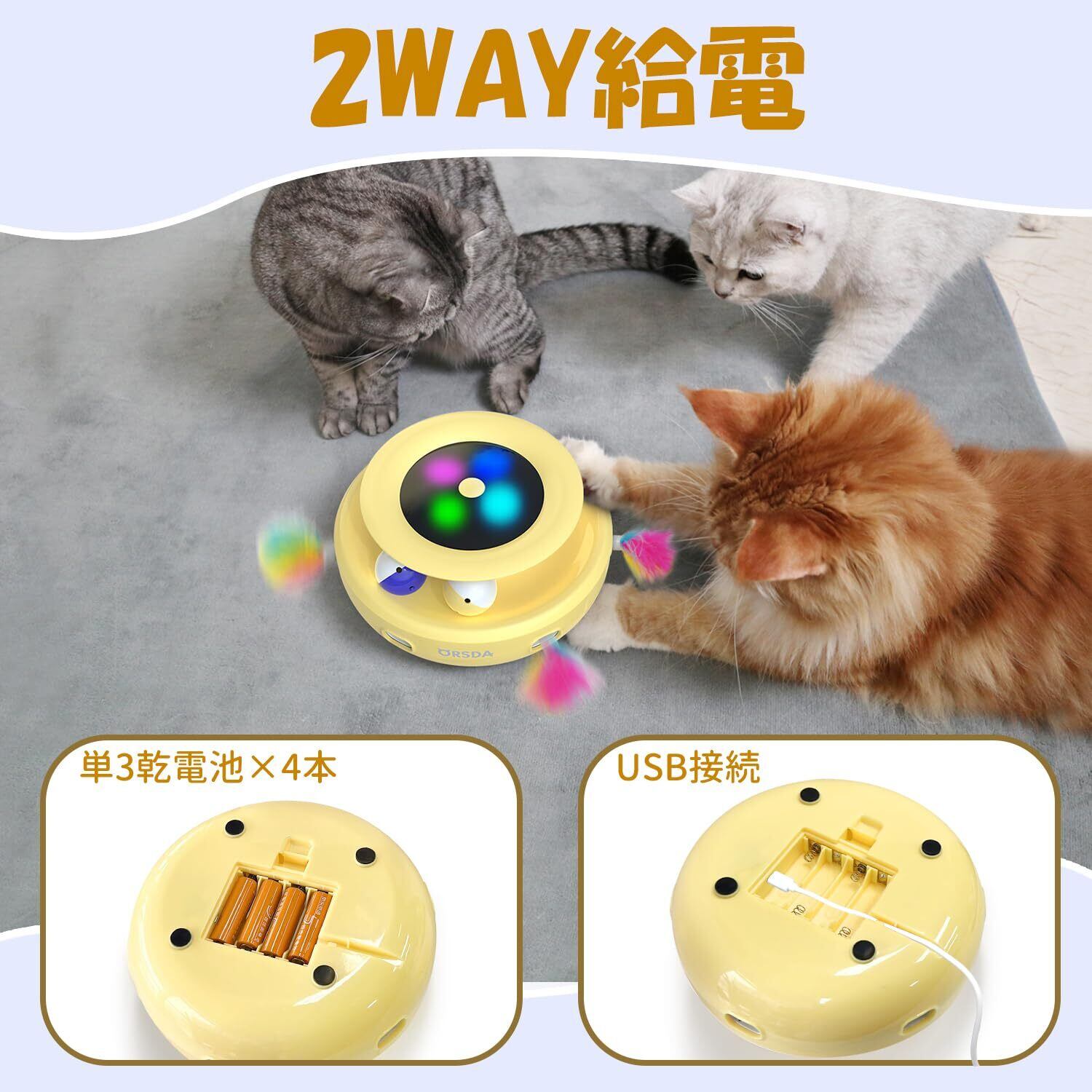 【2つ給電方式】給電方式が2種類備えており、利便性がアップします。電池:単3乾電池×4本使用(別売)を使って給電が可能である一方で、USBケーブルを使い、給電することもできます。電池が切れると猫ボール回転盤になり、充電されていると猫じゃらしになります。複数のペットなら一緒に遊べます。とても実用的な猫電動おもちゃです。