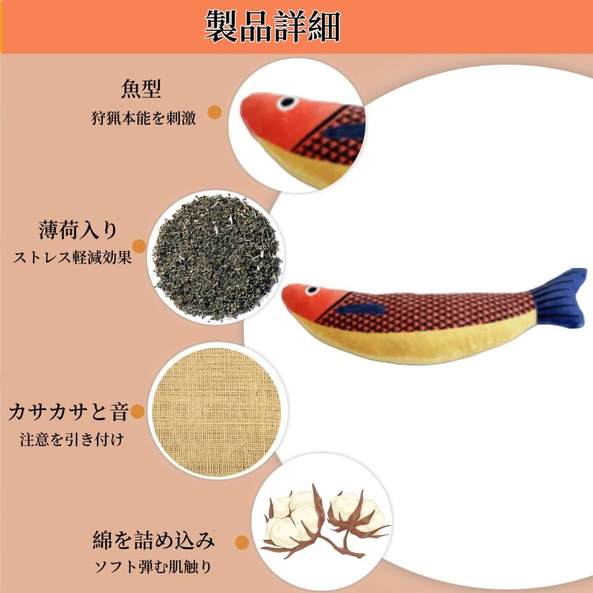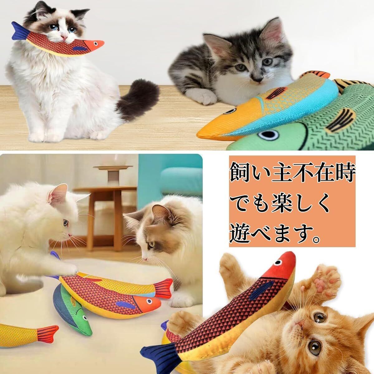 【製品仕様】かわいい魚型おもちゃの3色3個セット、サイズ:約23.5x6.6cm、軽量で投げたり咥えたりして遊ぶこともでき、猫んちゃんが存分に楽しめます。