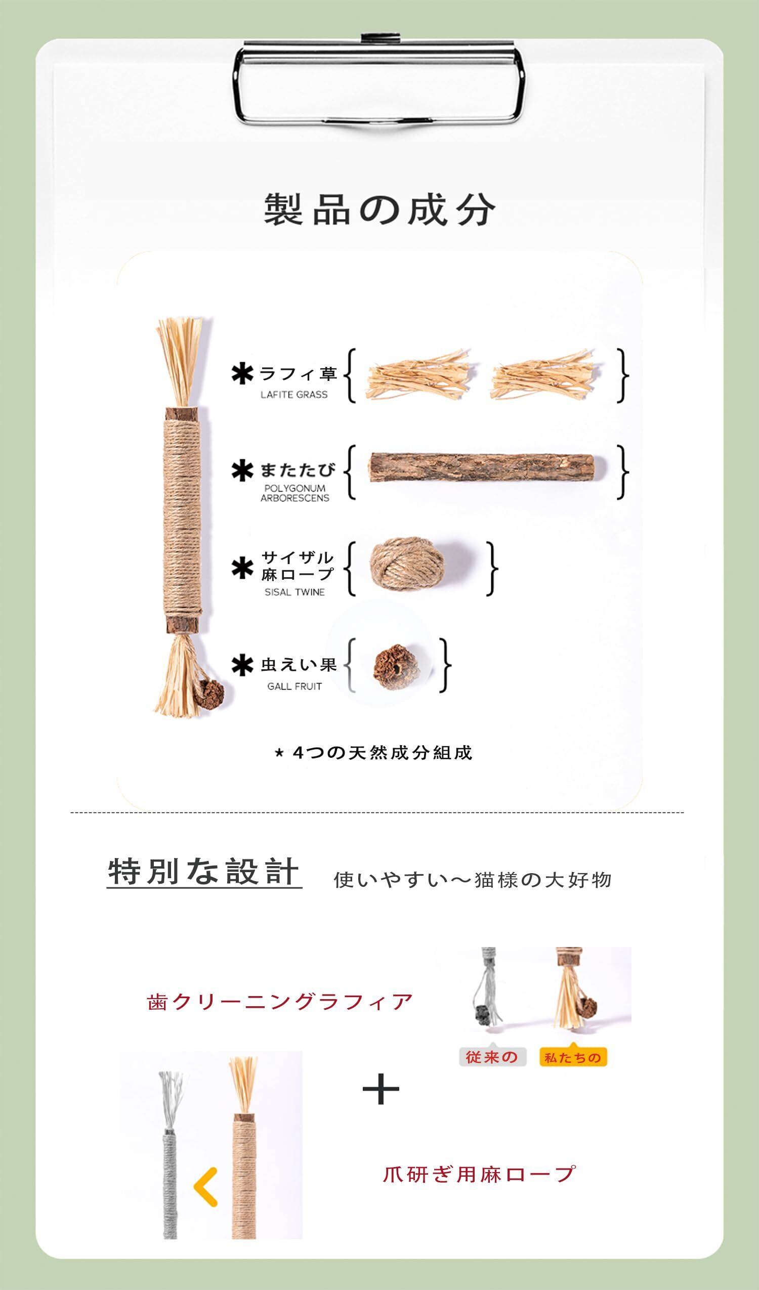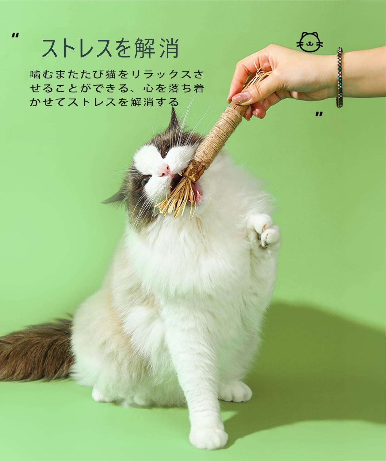 猫用おもちゃ人気 ,マタタビ ,猫 歯磨き おもちゃ,100%天然無添加素材またたび、虫えい果、ラフィ草、サイザル麻ロープ構成。 本品の持つ効果とは:ストレスを解消、食欲を促進、運動不足の解消、猫の老化を防ぐ、歯垢除去,口腔内を清潔を保つ、口臭の改善。 あなたの猫は常に家具や他の物を噛む場合、またたび猫の歯磨き棒は最高の解決策です。 家に置くだけで、自分の歯を噛んで、歯や不安を軽減します。 もちろん、旅先でも持ち運びができて、猫が旅先で歯を磨く楽しみ、旅の不快感を軽減し。 とても簡単で、またたび猫の歯磨き棒を猫に常除去する場所です。 猫が口腔の不快感や、噛む必要があるとき、歯ぐきを噛み、口への不快感を軽減します。 *ご注意 猫にまたたびを与える頻度は、1回与えたら間をあけて、ご褒美程度にするのがおすすめです。毎日のように与えていると、またたびに慣れてしまい、効果が出にくくなる場合があります。 *ご注意 清潔の効果がありますが、歯磨きの代わりにはなりません。 *ご注意 またたびへの反応は個体差があり、猫によってそれぞれ違います。 【製品仕様】猫歯磨き棒、6個袋、1個約22cm、重量約23g