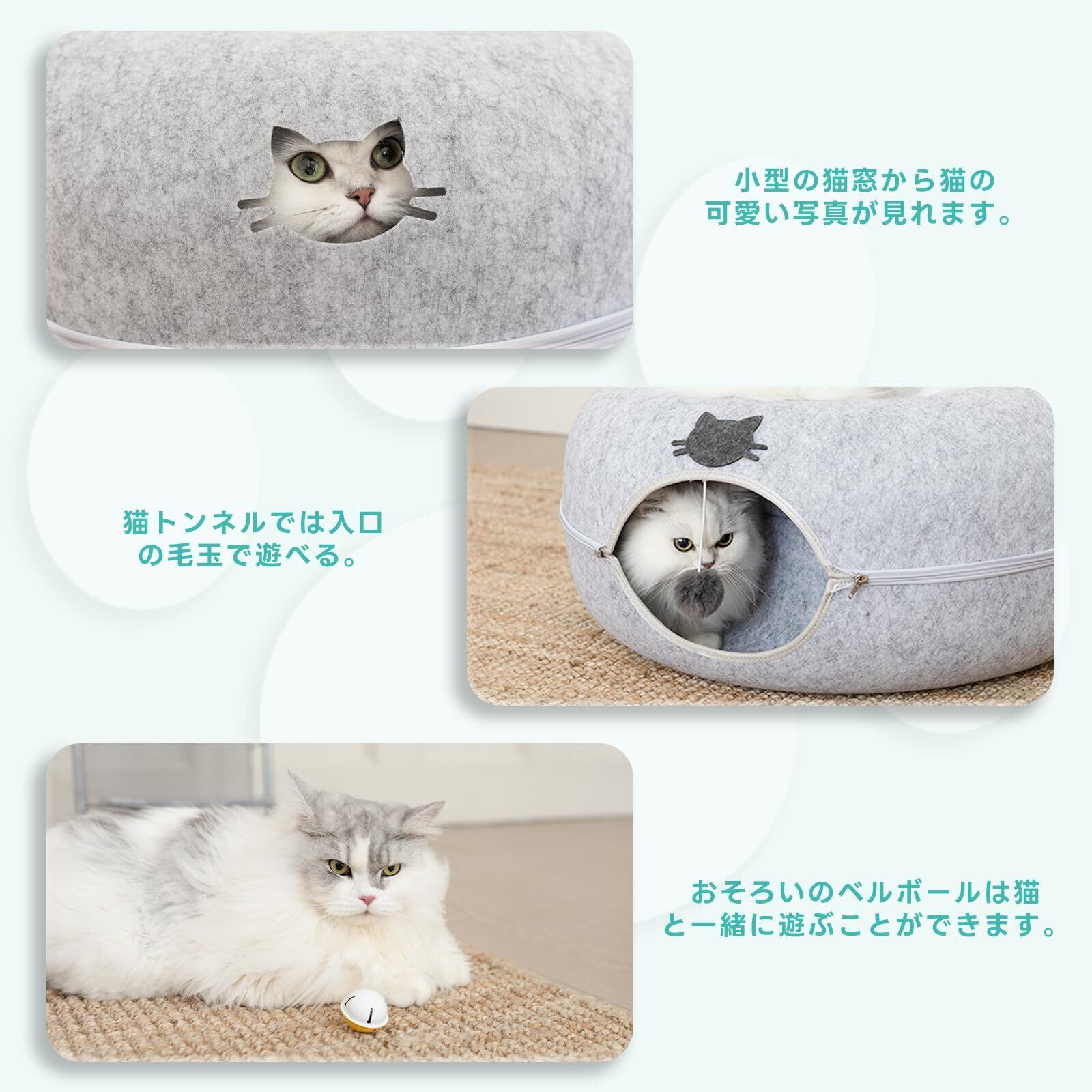 【インタラクティブな遊び】キャットトンネル入り口の毛玉は猫の興味を引きます。猫の形をした小さな窓があり、猫が手を伸ばして遊んだり、中の様子を確認したりすることができます。小さな鈴のおもちゃが3個付いており、ジャンプしたり追いかけたり遊んだりするのにちょうど良いサイズで、猫の自然な本能を刺激します。寝たり休んだりするスペースとしてだけでなく、遊びや爪とぎの場所としても最適です。インタラクティブな遊びを促進し、ペットと飼い主の絆を深めます。