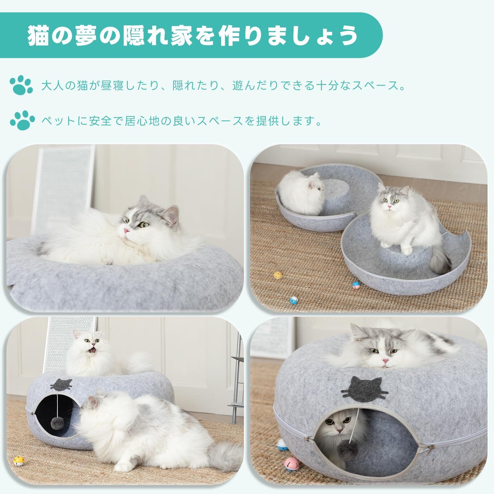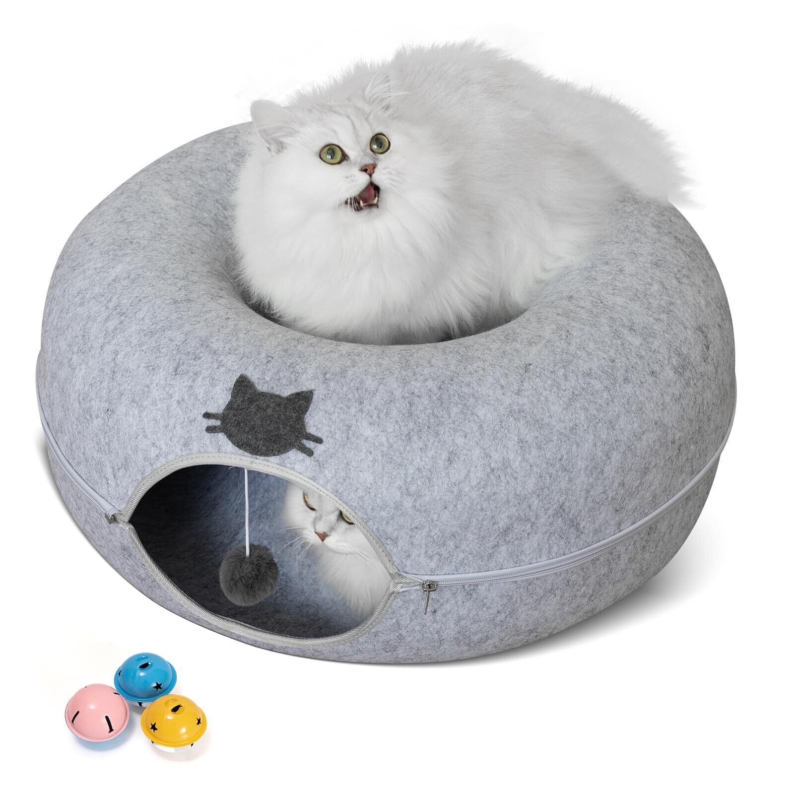 【安全無毒で安心使用します】この猫のドーナツベッドトンネルは、形状を維持し、通常の使用に耐えるように厳選された耐久性のあるフェルト素材で作られており、耐久性があり、毒性がなく、防臭性があり、毛羽立ったボールの形成を防ぎ、引っかき傷や摩擦から安全です。最大23ポンドの荷重に耐えることができます。ドームの凹面デザインにより、他の猫がお互いを邪魔することなく休むことができます。