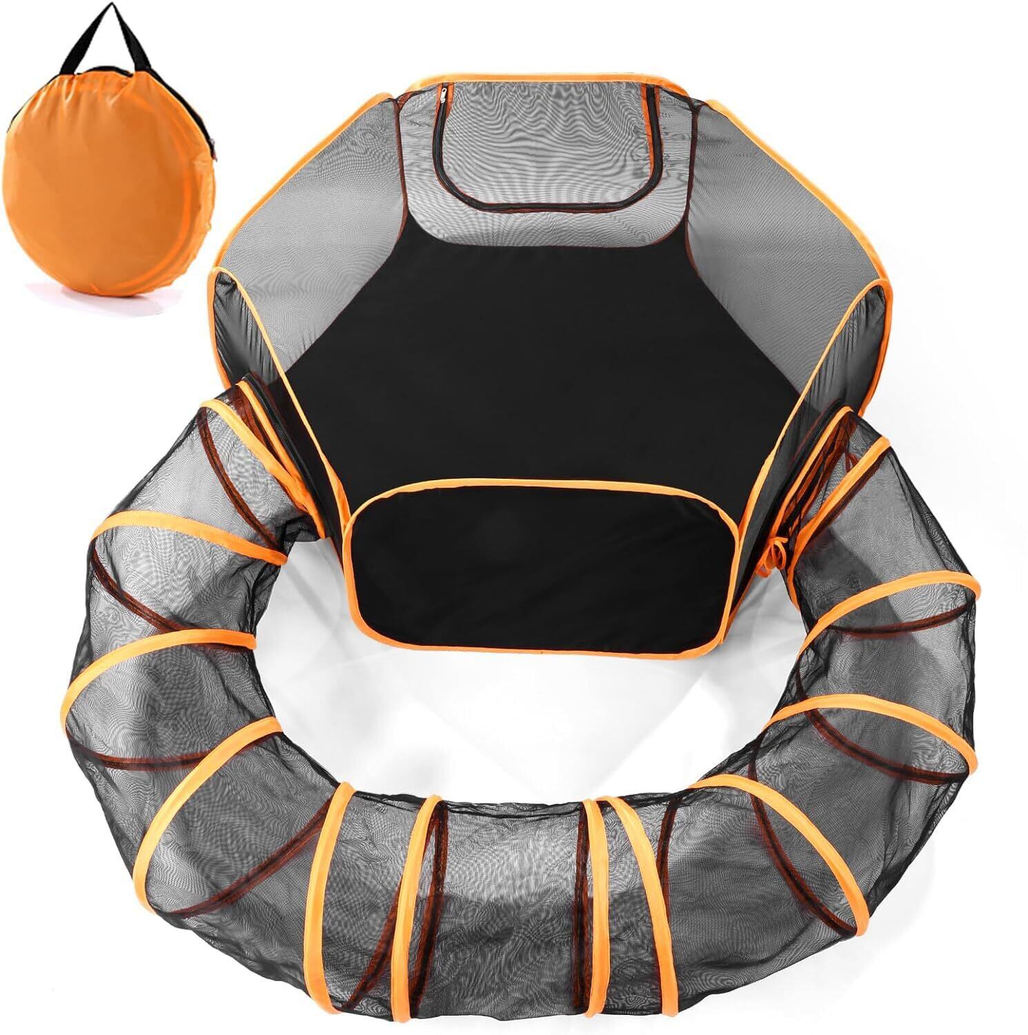Odoland 120cmペットサークル+315cmトンネル 折りたたみ式 六角形 大型猫トンネル 犬用プレイサークル 小動物ベビーサークル テント ケージ 分娩室 ゲームフェンス プレイハウス メッシュキャットトンネル 転落防止ネット