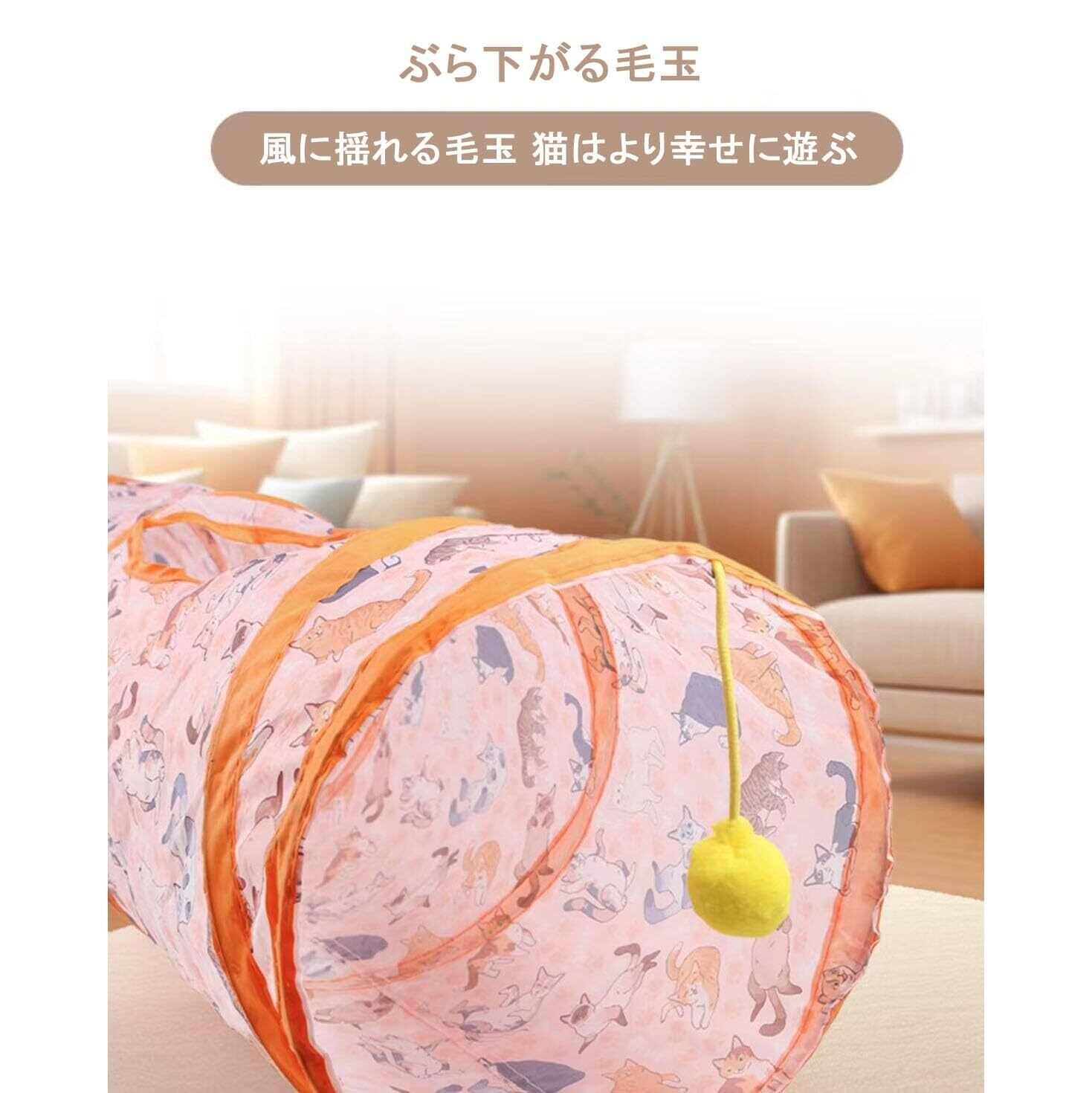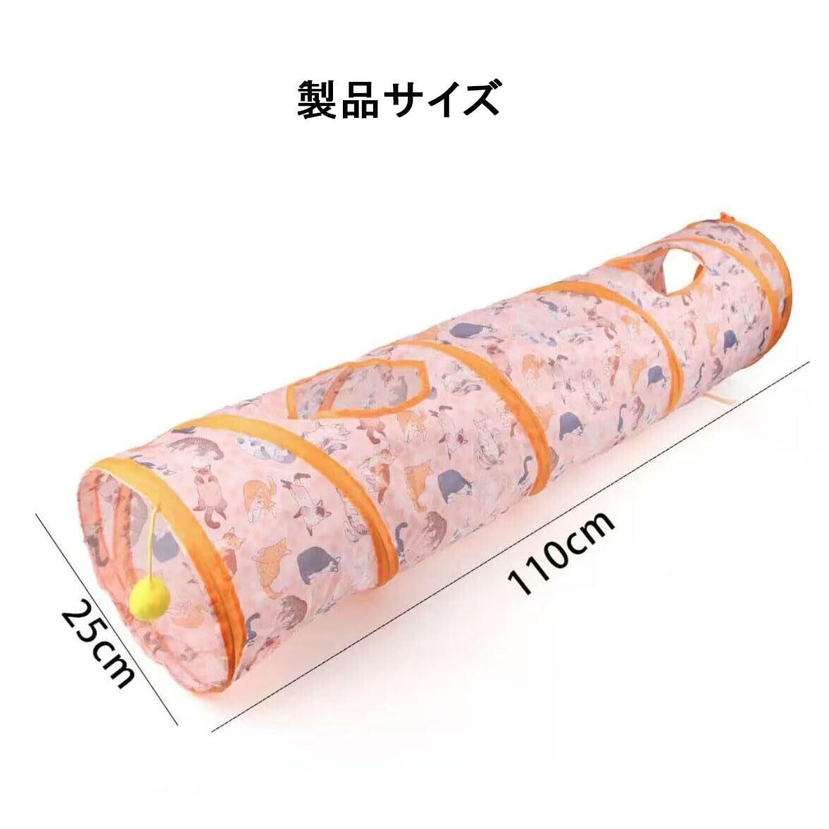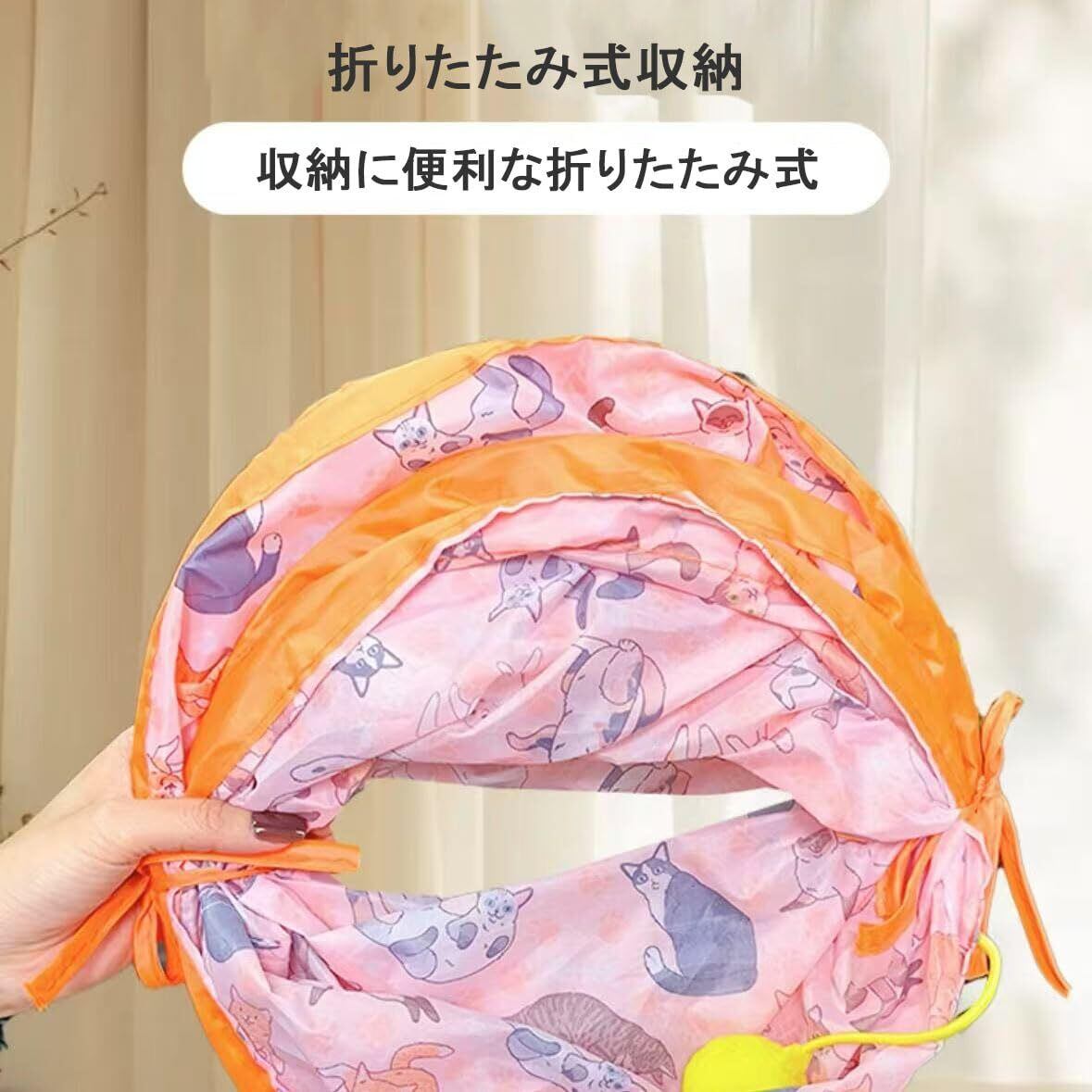 折りたたみ式で収納楽々な直線型キャットトンネル:使用後はコンパクトに折り畳める便利設計。おもちゃボール付きで、猫の一人遊びを自然に促します。