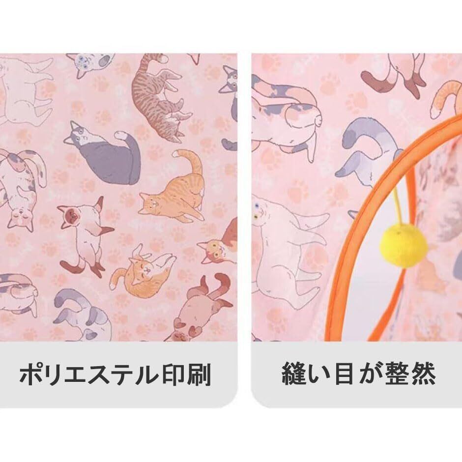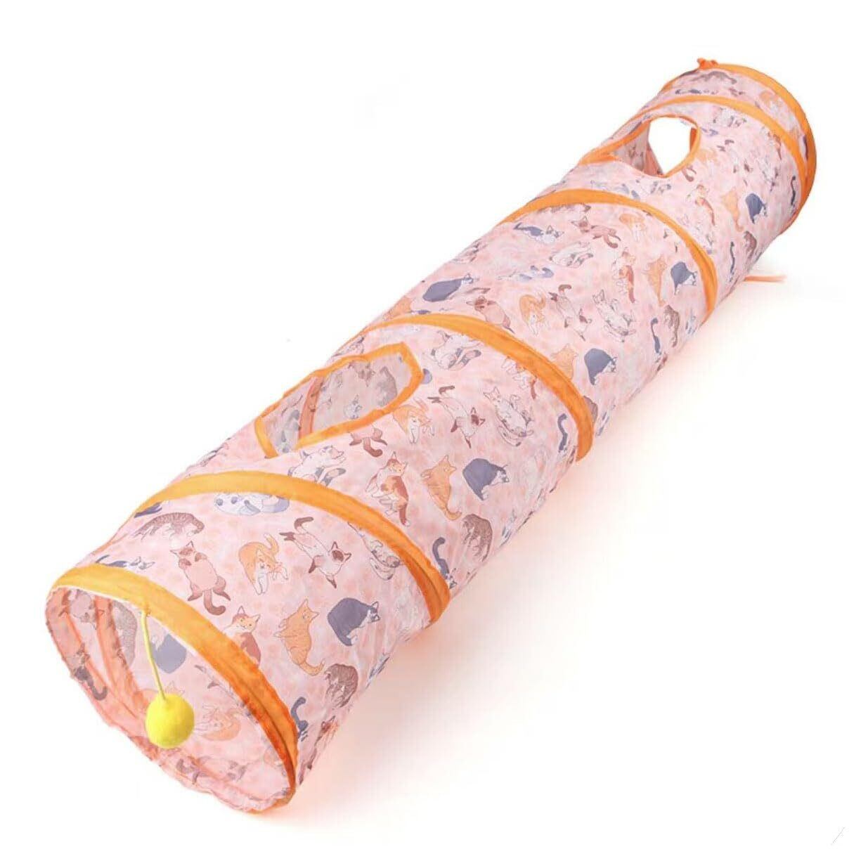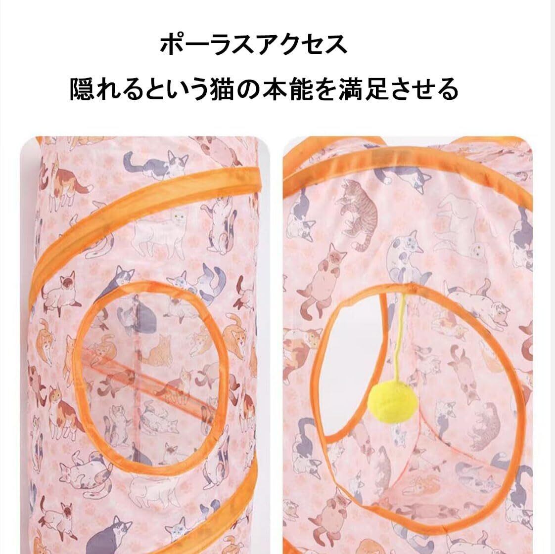 折りたたみ式で収納楽々な直線型キャットトンネル:使用後はコンパクトに折り畳める便利設計。おもちゃボール付きで、猫の一人遊びを自然に促します。