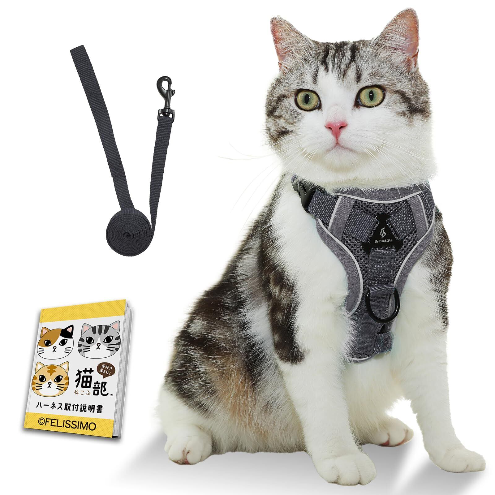 フェリシモ 猫部 猫 専用 ハーネス 取付説明書付 首輪感覚で簡単装着 足を上げず装着 防災 災害 避難 超軽量 柔らか素材 首輪 胴輪 反射材 (Mサイズ、グレー)