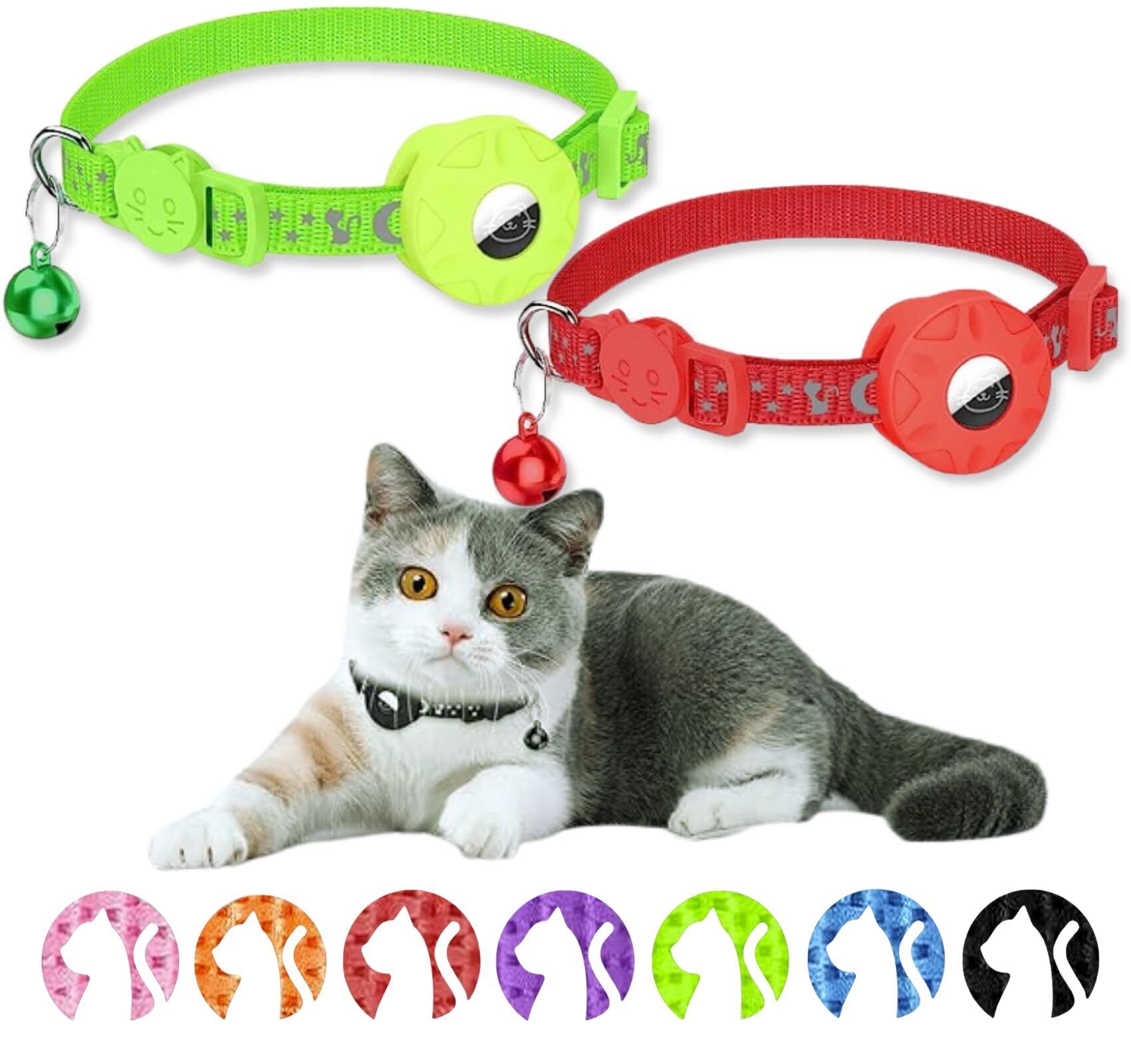 AlxMuNao Airtag gps 猫用首輪 gps 猫 エアタグ 用の ペット 追跡装置 安全 犬 猫用首輪猫 頑丈耐用です そして 光反射のデザインを加えて 紛失防止 ベル付き調節可能な 注意:この商品にはエアタグは含まれておりません (2本·新緑紅葉)