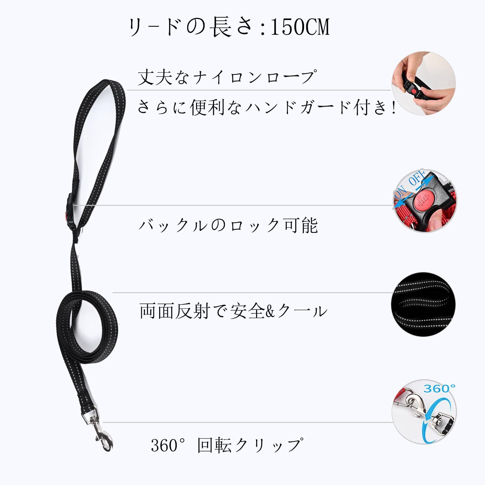 360°反射材で安全を確保 光を反射する反射材が付いているから夜間でも歩道を歩く人には知らせ、車や自転車のライトには反射が光るから猫ちゃん、ワンちゃんとより安全にお散歩できます。 付属のハンドガード付きリードも発光する反射素材を使っており、より効果的なコントロールが可能となり、紛失の防止にも役立ちます。