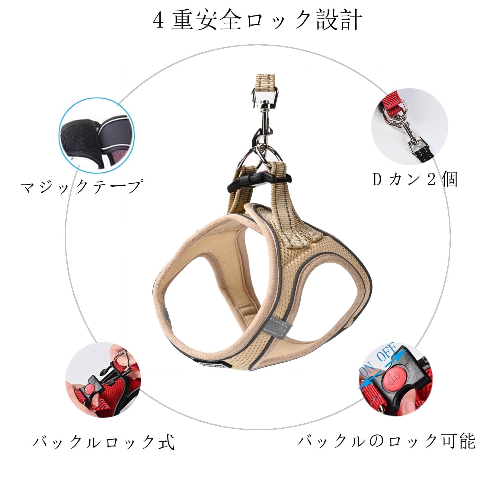 4重安全ロック設計で抜けにくい マジックテープとバックルのダブルロック式、さらにアジャスターにON/OFFボタンあり、しっかり猫ちゃんとワンちゃんをホールドします。 脱走防止も万全!元気なおペットでもしっかりホールドします。