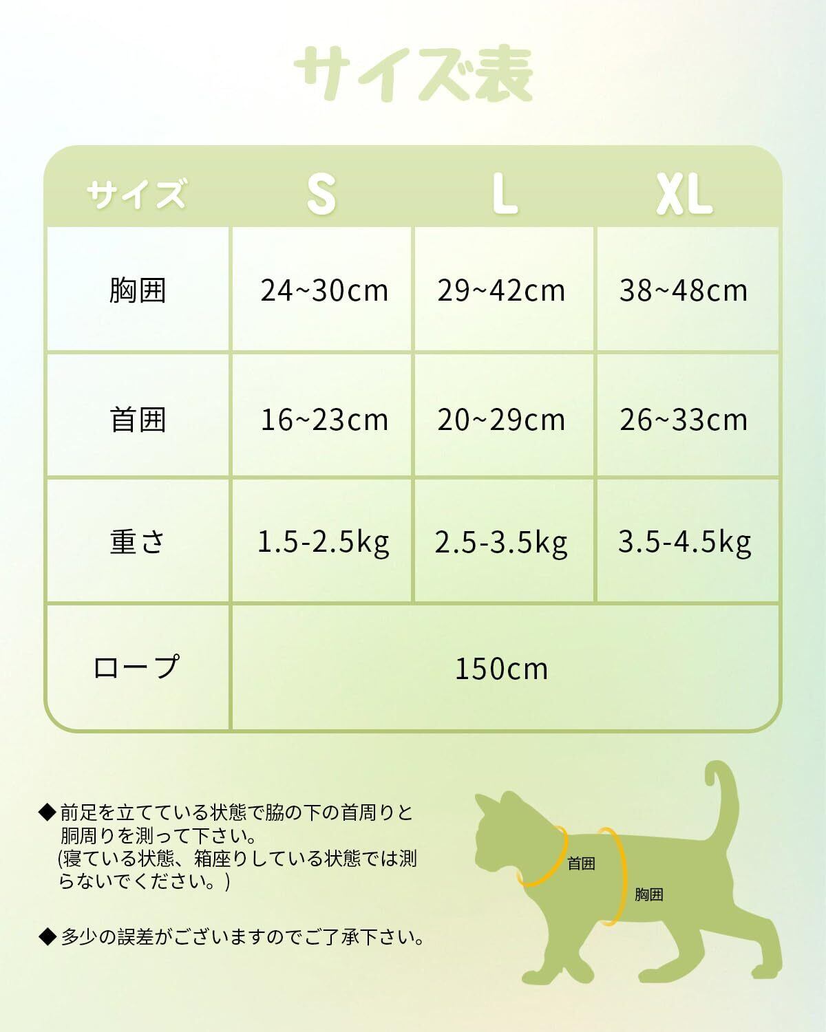 【商品仕様】猫 リード サイズは3種類あり、S(首回り:16-23cm バスト:24-30cm 推薦体重:1.5-2.5kg);L(首回り:20-29cm バスト:29-42cm 推薦体重:2.5-3.5kg);XL(首回り:26-33cm バスト:38-48cm 推薦体重:3.5-4.5kg)。ご注文前にペットを測定してください。猫が2つのサイズの間にある場合は、より大きいサイズを選択してください。