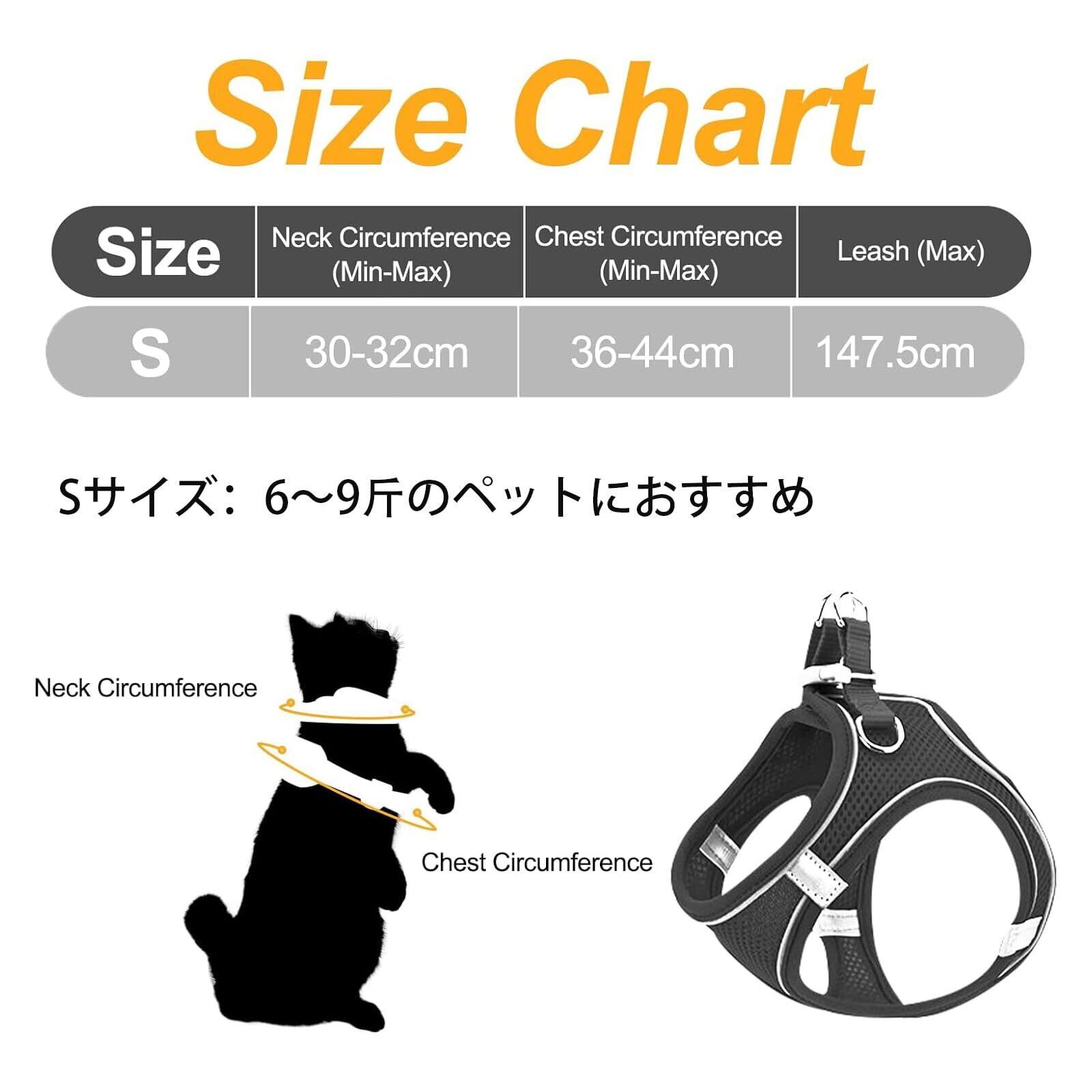 【 サイズ調整可能 で多様なペットに適用】:このハーネスは、猫ちゃんの首囲と胴囲に合わせて サイズ調節 が可能です。サイズ選択の際は、実際に首囲と胴囲を測定しご選択下さい。 『 Sサイズ :首囲 約30-32cm、胸囲 約36-44cm ,本製品には150cmのリードが付属し、表示サイズ範囲内の小型犬と成猫に対しての使用に適しています.4.5-6.5キロの子猫には使用をおすすめ。