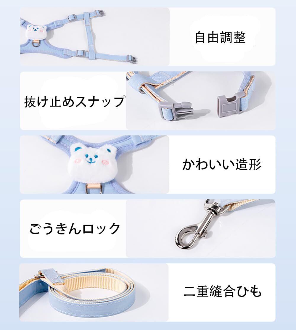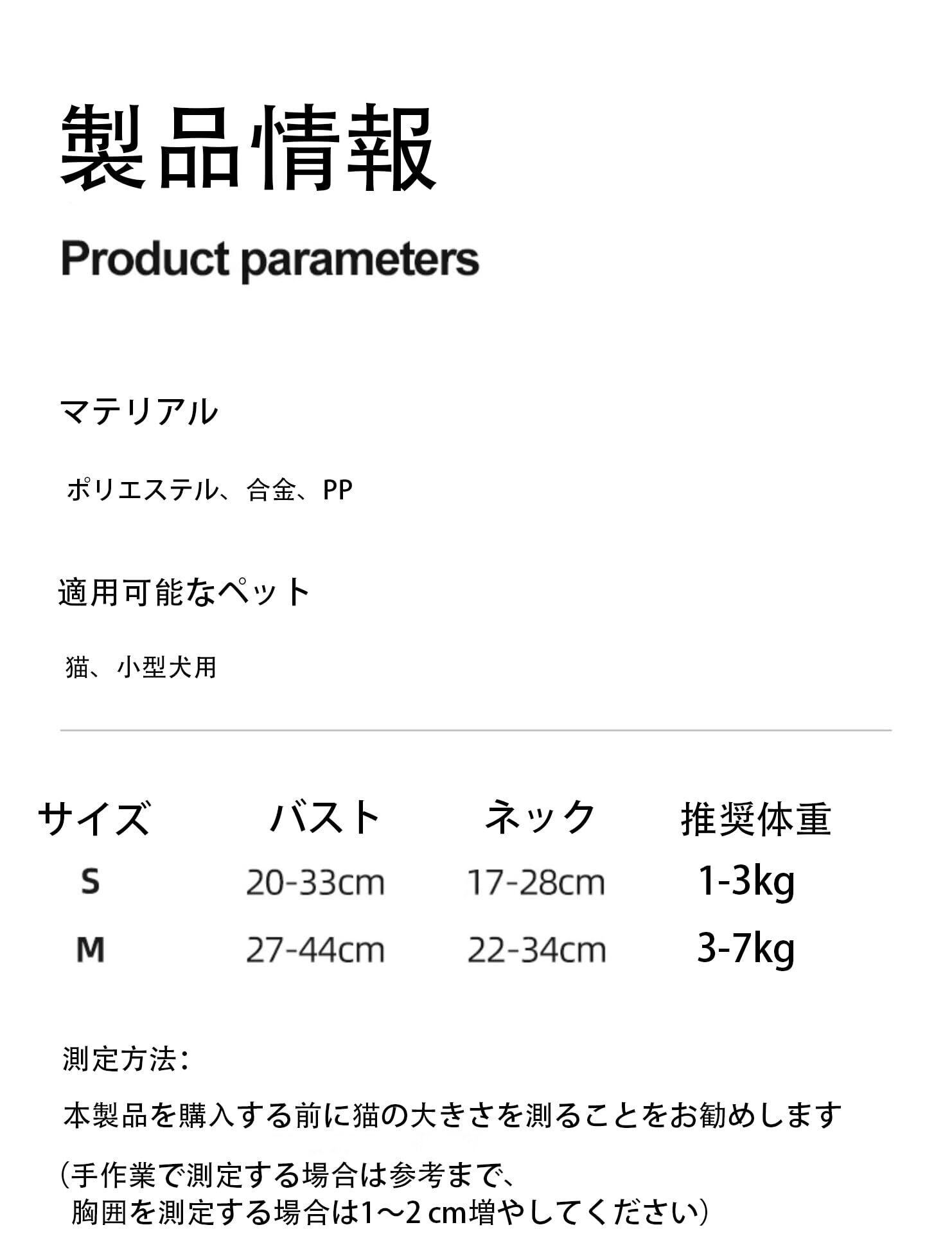 サイズ:リードの長さは120cm。サイズは2種類あり、S(ネック:17-28cm バスト:20-33cm);M(ネック:22-34cm バスト:27-44cm)。ご注文前にペットを測定してください。猫が2つのサイズの間にある場合は、より大きいサイズを選択してください
