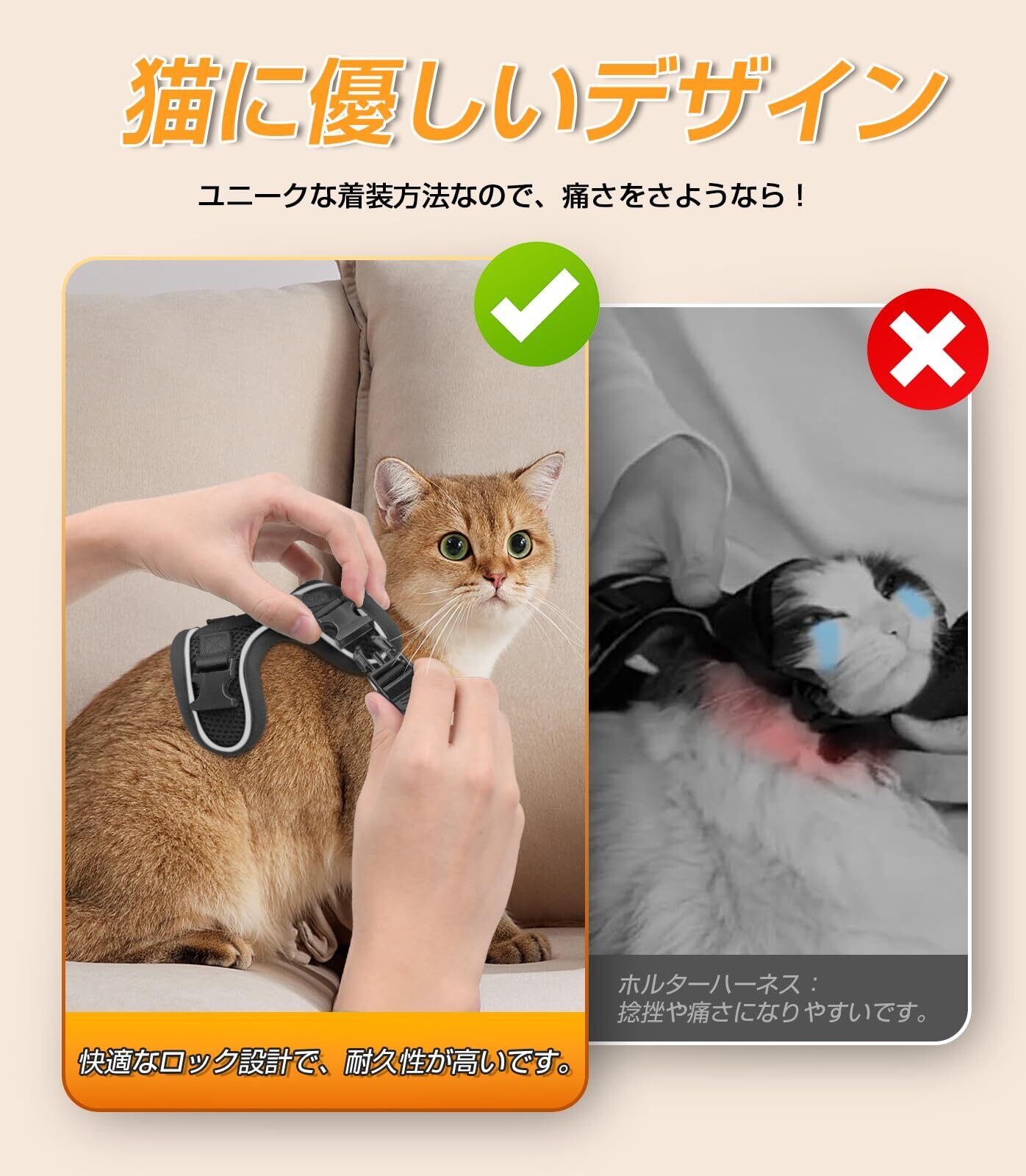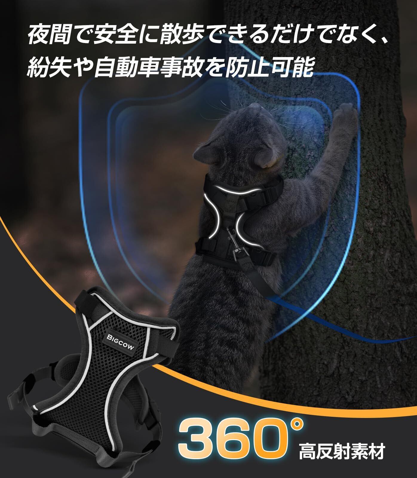 /耐久性と夜間の安全性を兼ね備えた\ ▶/使用安心\薄暗い場所や夜間の使用中視認しやすいように、首元と胴回りにはくっきりと発光する反射素材を使っており、夜間の散歩中に車や自転車のライトを反射 し、ペットの視認性を高めて安全を確保できます。夜になっても猫ちゃんとより安全に楽しくお散歩できます!繋げる部分にあるDカンとナスカンの留め具は耐衝撃性に優れた亜鉛合金製なので、高い引張強度があり、丈夫で錆も強いで安心してお使い頂けます。付属の猫リードと合わせて使用することで、より効果的なコントロールが可能となり、迷子の防止にも役立ちます。普段の散歩 、 外出 、災害時の避難用としても大活躍します。